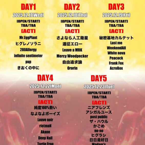 天翔龍閃a.k.aあまちゃん(ORANGE RANEGE縛り) / kyon(昭和歌謡ロック縛り) / DJ検討中(特撮シリーズ縛り) / しづみ(平成ハロプロ縛り) / TKGK(KOH-GEN RECORDS) (多分みんなが知ってる曲縛り) / Takkar (ヴィジュアル系アーティストがカバーしたJ-POP歌謡曲縛り) / たくちん(音ゲー縛り) / 変態理科の先生(サビだけALONE縛り) / ポール(Mr.Children縛り) / マコトハット(ヲタ霊/ヤシオリノオト) (コピーした事のある楽曲縛り) / Mary Ann (ずっと真夜中でいいのに。縛り) / やまたにえん(ガンダム縛り) / YUA(顔出ししてないアーティスト縛り) / 憂漓(ヲタ霊/ロリポップ) (名探偵コナン縛り) / RAM(???縛り)