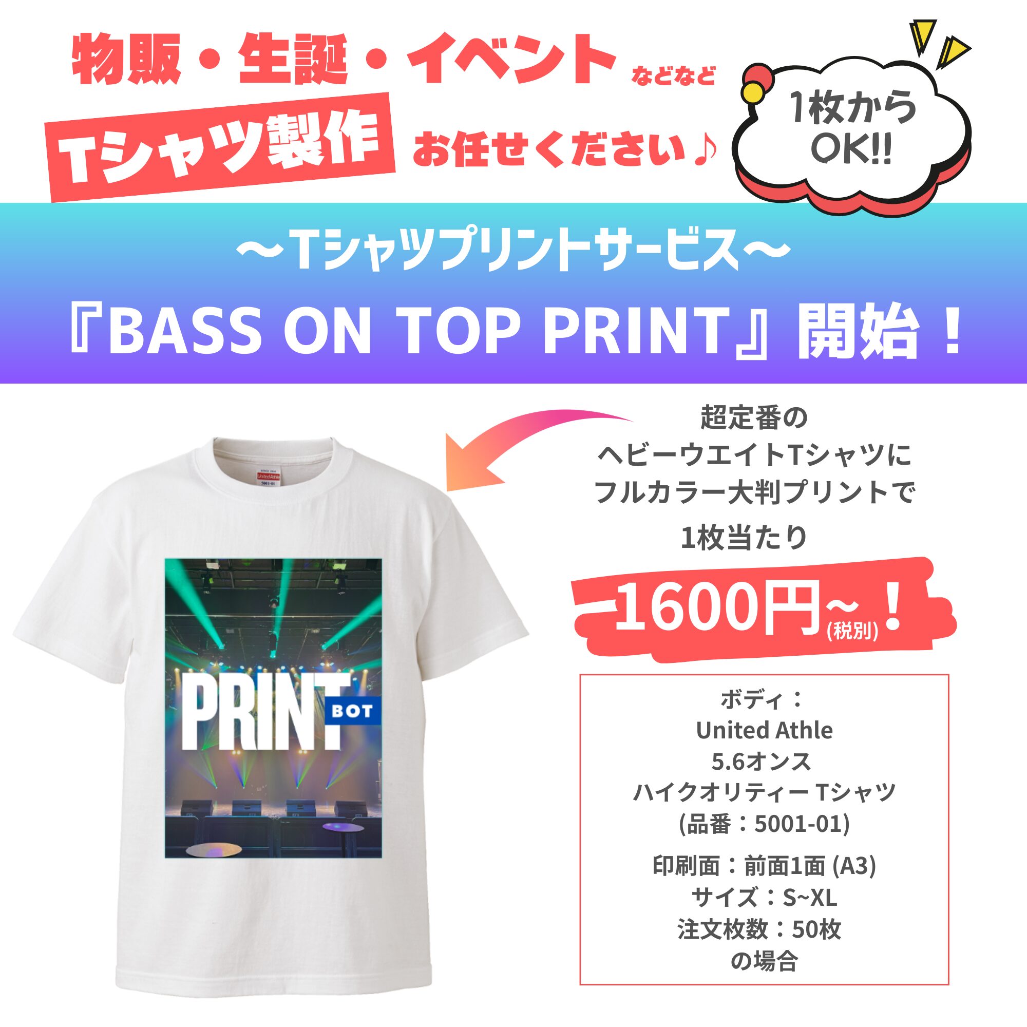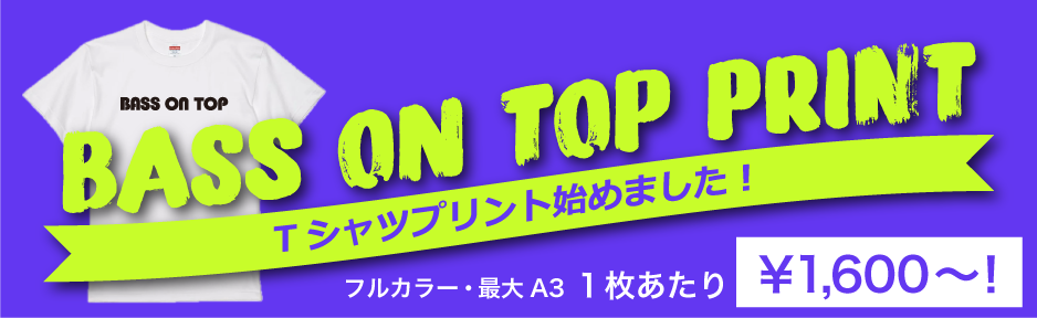 Tシャツプリントサービス【BASS ON TOP PRINT】開始!! Information X Facebook LINE コピー 2025.09.29 BASS ON TOPが新たにプリントTシャツ制作サービスを始めました! 物販。生誕・イベントなどなど、【Tシャツ製作】お任せください♪ 超定番のヘヴィーウエイトTシャツに、フルカラー大判プリントで1枚当たり1,600円~! ▼料金や注文・お問合せ先など、詳しくはコチラをご覧ください!▼