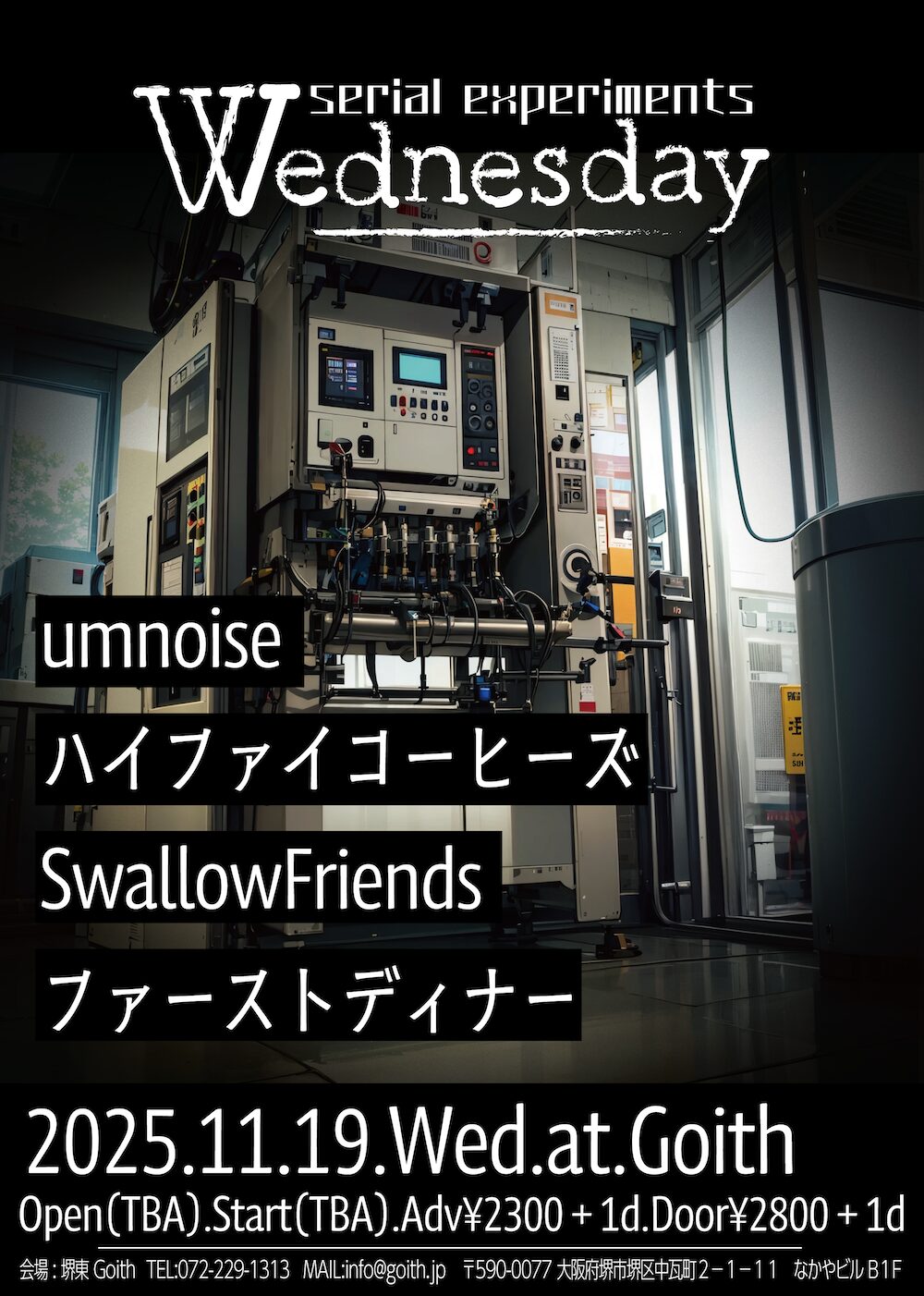 11.19(Wed) Serial experiments Wednesday 堺東Goith X Facebook LINE コピー 2025.10.082025.11.03 ACTUmnoise / ハイファイコーヒーズ / ファーストディナー / SwallowFriends イベント詳細 堺東 Goith(ゴイス)|大阪 堺東のライブハウスベースオントップグループのライブハウス『堺東Goith』南海高野線の堺東からすぐの、粋なライブハウスです。