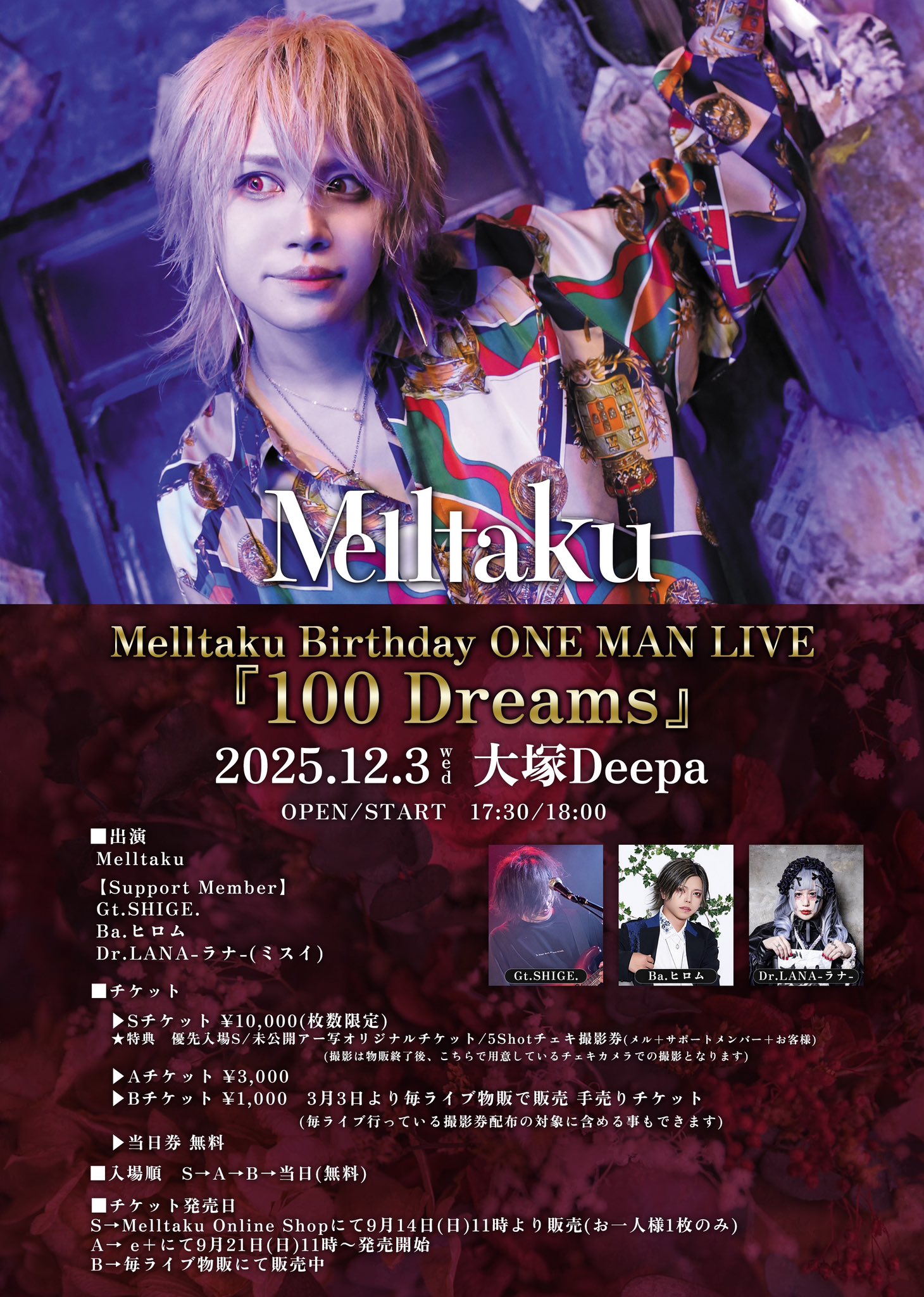 12.03(Wed) Melltaku Birthday ONE MAN LIVE 『100 Dreams』 大塚Deepa X Facebook LINE コピー 2025.11.03 ACTMelltaku Support Member Gt.SHIGE. Ba.ヒロム Dr.LANA-ラナ-(ミスイ) イベント詳細 大塚Deepa|東京 大塚のライブハウスベースオントップグループのライブハウス『大塚Deepa』東京山手線大塚駅徒歩1分!!にあるライブハウス/クラブです。