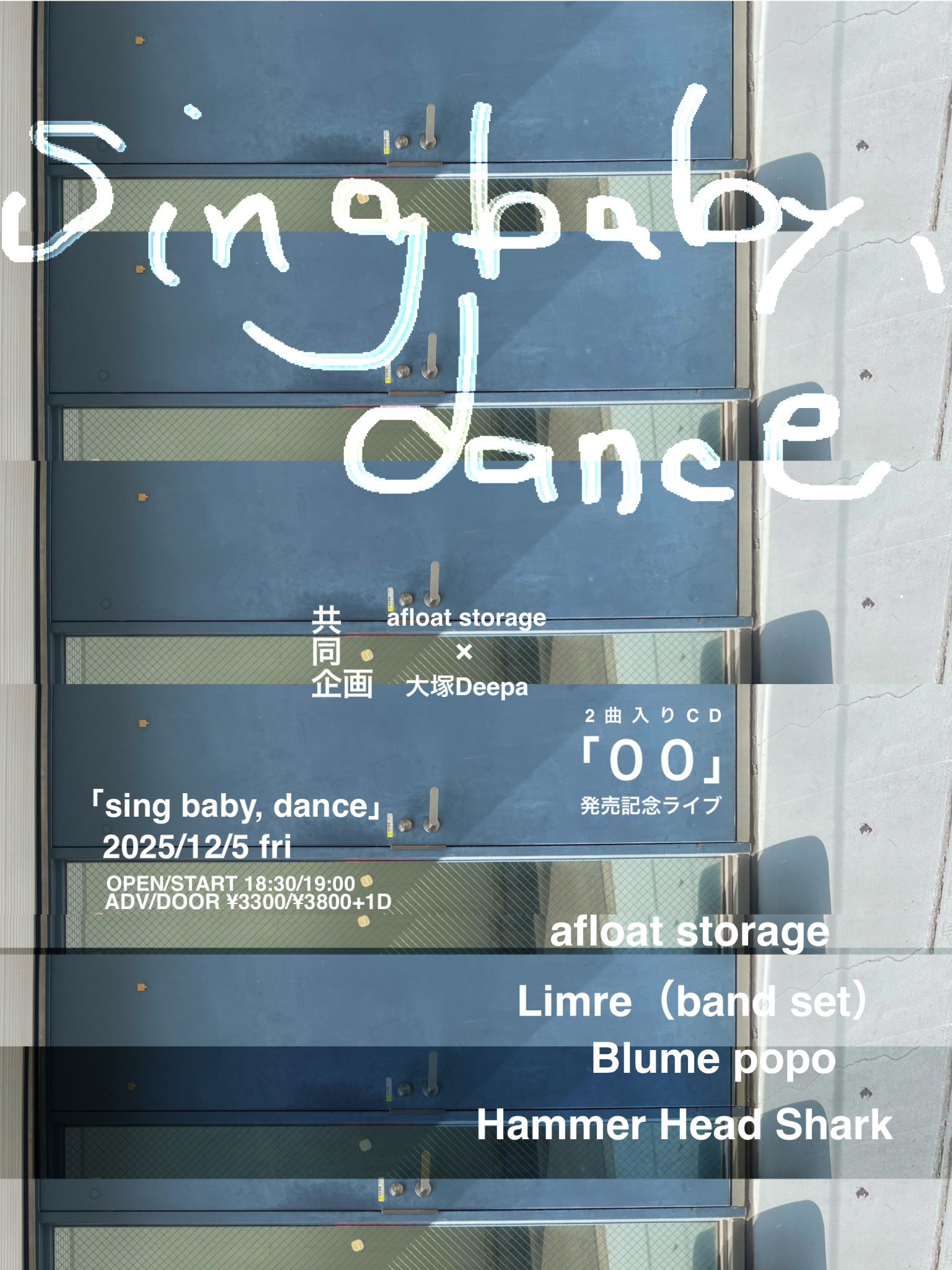 12.05(Fri) afloat storage × 大塚Deepa 共同企画 「sing baby, dance」 2曲入りCD「00」発売記念ライブ 大塚Deepa X Facebook LINE コピー 2025.11.03 ACTafloat storage / Limre(band set) / Blume popo / Hammer Head Shark イベント詳細 大塚Deepa|東京 大塚のライブハウスベースオントップグループのライブハウス『大塚Deepa』東京山手線大塚駅徒歩1分!!にあるライブハウス/クラブです。