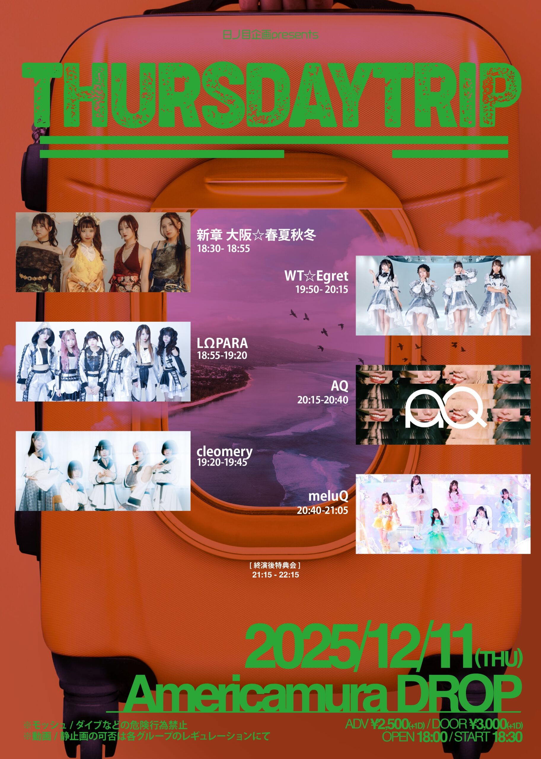 12.11(Thu) 日ノ目企画presents “THURSDAYTRIP” アメリカ村DROP X Facebook LINE コピー 2025.11.18 ACTAQ / cleomery / 新章 大阪☆春夏秋冬 / WT☆Egret / meluQ / LΩPARA イベント詳細 アメリカ村 DROP(ドロップ)|大阪 心斎橋アメ村のライブハウスベースオントップグループのライブハウス『アメリカ村 DROP(ドロップ)』大阪アメリカ村の中心地にあるライブハウスです。
