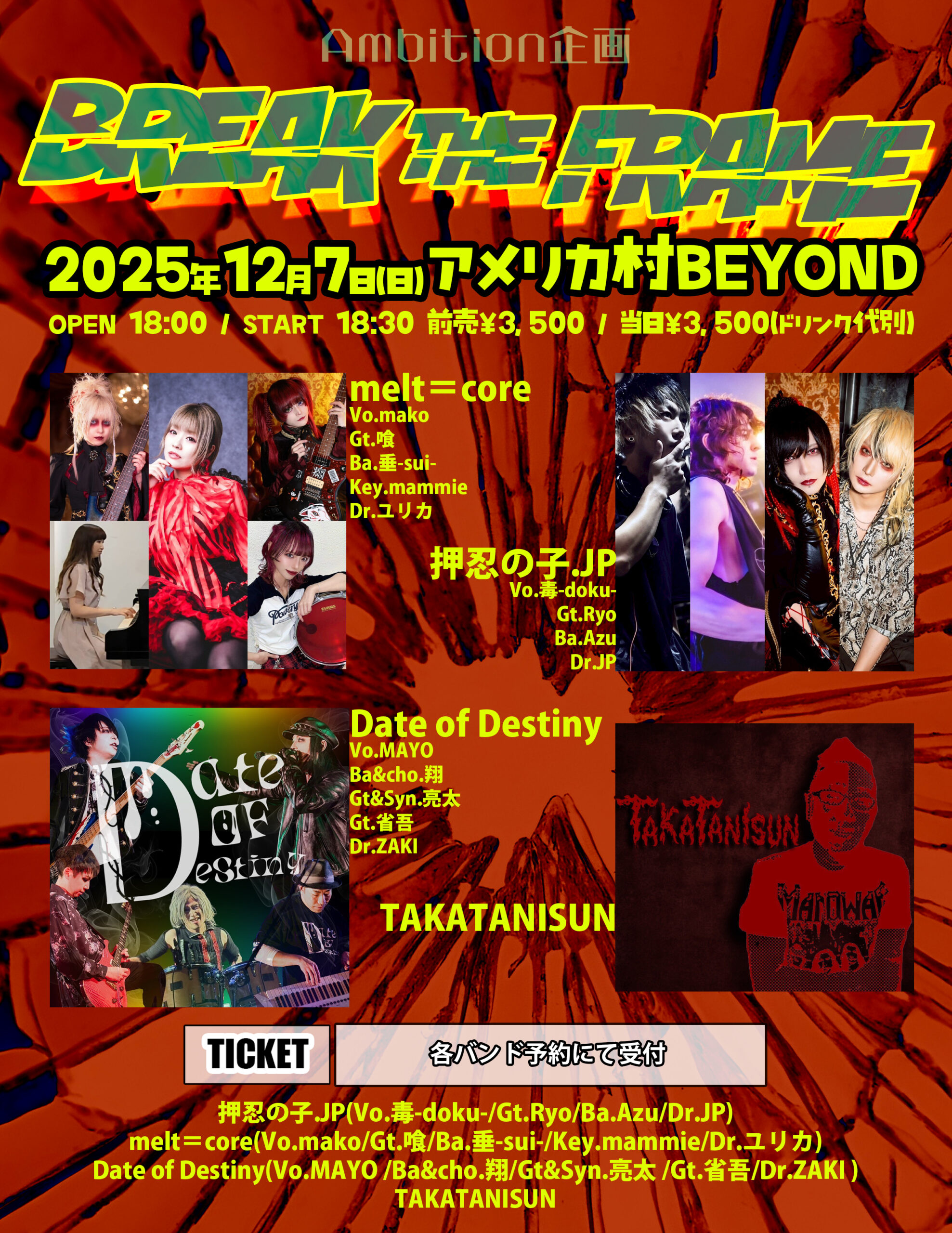 押忍の子.JP(Vo.毒-doku- / Gt.Ryo / Ba.Azu / Dr.JP) melt=core(Vo.mako / Gt.喰 / Ba.垂-sui- / Key.mammie / Dr.ユリカ) Date of Destiny(Vo.MAYO / Ba&cho.翔 / Gt&Syn.亮太 / Gt.省吾 / Dr.ZAKI ) TAKATANISUN