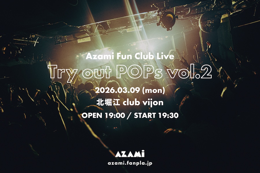 03.09(Mon) Azami Fun Club Live Try out POPs vol.2 北堀江 club vijon X Facebook LINE コピー 2025.11.22 ACTAzami Fun Club Live Try out POPs vol.2 イベント詳細 北堀江 club vijon(クラブビジョン)|大阪 北堀江のライブハウスベースオントップグループのライブハウス『北堀江club vijon』大阪北堀江にあるライブハウスです。
