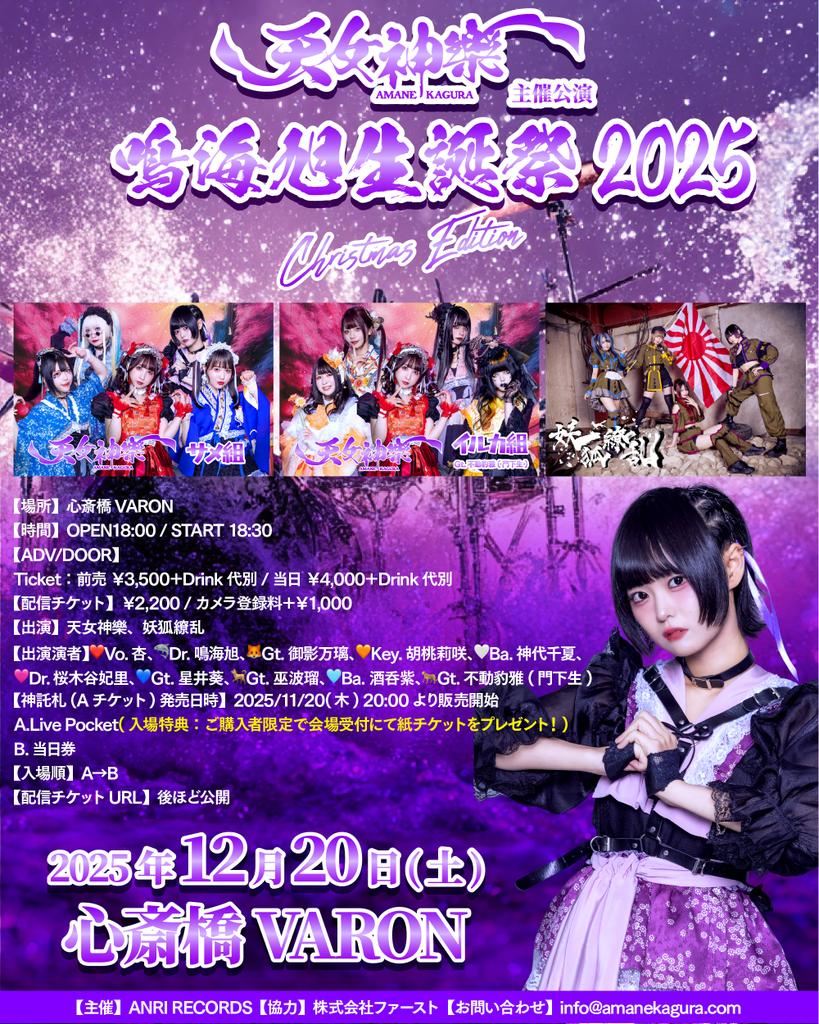 12.20(Sat) 天女神樂『鳴海旭 生誕祭2025』christmas edition 心斎橋VARON X Facebook LINE コピー 2025.11.24 ACT天女神樂「サメ組」 / 天女神樂「イルカ組」 / 妖狐繚乱 イベント詳細 心斎橋 VARON(ヴァロン)|大阪 心斎橋のライブハウス大阪にあるライブハウス「心斎橋VARON」アーティストのパフォーマンスを最大限に引き出すことをコンセプトにしたステージ・音響・照明。ジャンルや形態を超え、様々なイベントに完全対応いたします。音楽スタジオベースオントップ併設。