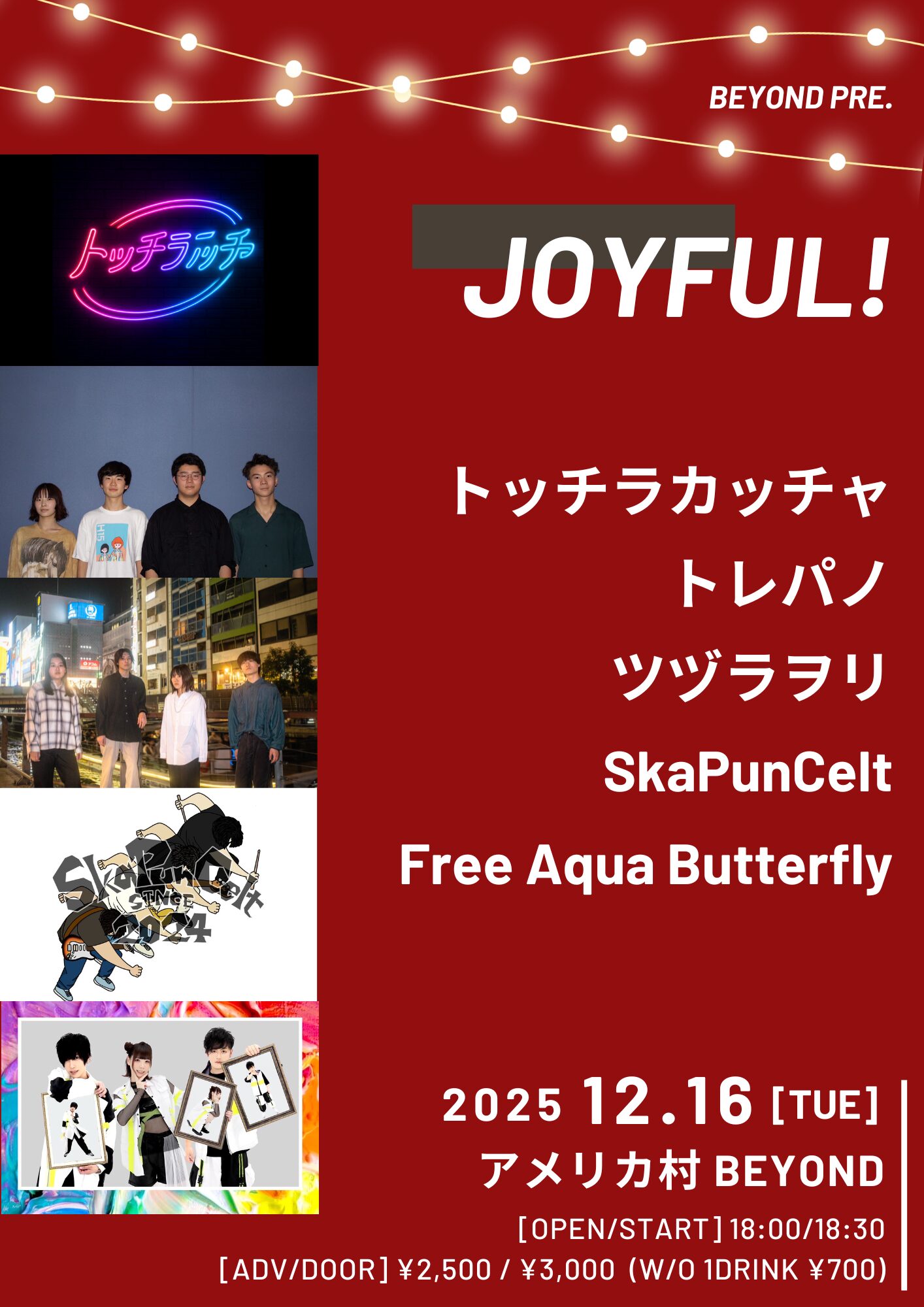 12.16(Tue) JOYFUL! アメリカ村BEYOND X Facebook LINE コピー 2025.12.04 ACTトッチラカッチャ / トレパノ / ツヅラヲリ / SkaPunCelt / Free Aqua Butterfly イベント詳細 アメリカ村 BEYONDベースオントップグループのライブハウス『アメリカ村 BEYOND(ビヨンド)』大阪アメリカ村の中心地にあるライブハウスです。