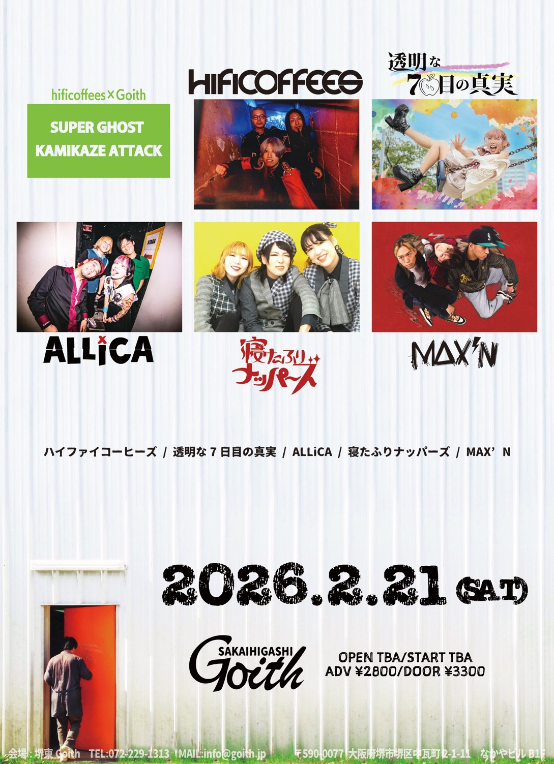 02.21(Sat) ハイファイコーヒーズ×Goith [SUPER GHOST KAMIKAZE ATTACK vol.26] 堺東Goith X Facebook LINE コピー 2025.12.06 ACTハイファイコーヒーズ / ALLiCA / MAX’N / 寝たふりナッパーズ / 透明な7日目の真実 イベント詳細 堺東 Goith(ゴイス)|大阪 堺東のライブハウスベースオントップグループのライブハウス『堺東Goith』南海高野線の堺東からすぐの、粋なライブハウスです。