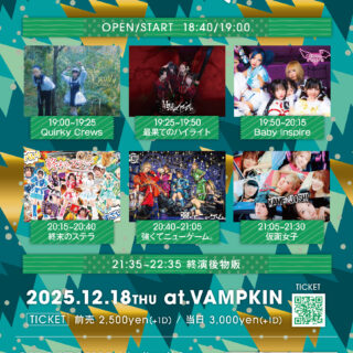 12.27(Sat) 泉さくら卒業公演〜ずっと君のヒロイン!〜 浅草VAMPKIN X Facebook LINE コピー 2025.12.06 ACTKATACOTO*BANK / 櫻井ねる(ゲスト) イベント詳細 浅草 VAMPKINベースオントップグループのライブハウス『浅草 VAMPKIN(アサクサ ヴァンプキン)』東京浅草にあるライブハウスです。