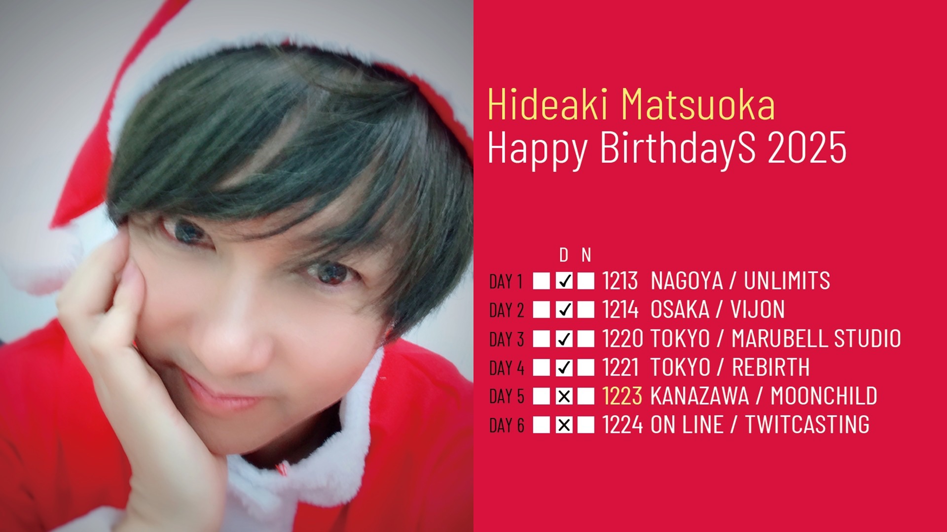 12.14(Sun) 松岡英明生誕祭《Happy BirthdayS 2025》東名阪ツアー+_大阪公演 北堀江 club vijon X Facebook LINE コピー 2025.12.07 ACT松岡英明 イベント詳細 【昼公演】 北堀江 club vijon(クラブビジョン)|大阪 北堀江のライブハウスベースオントップグループのライブハウス『北堀江club vijon』大阪北堀江にあるライブハウスです。 【夜公演】 北堀江 club vijon(クラブビジョン)|大阪 北堀江のライブハウスベースオントップグループのライブハウス『北堀江club vijon』大阪北堀江にあるライブハウスです。