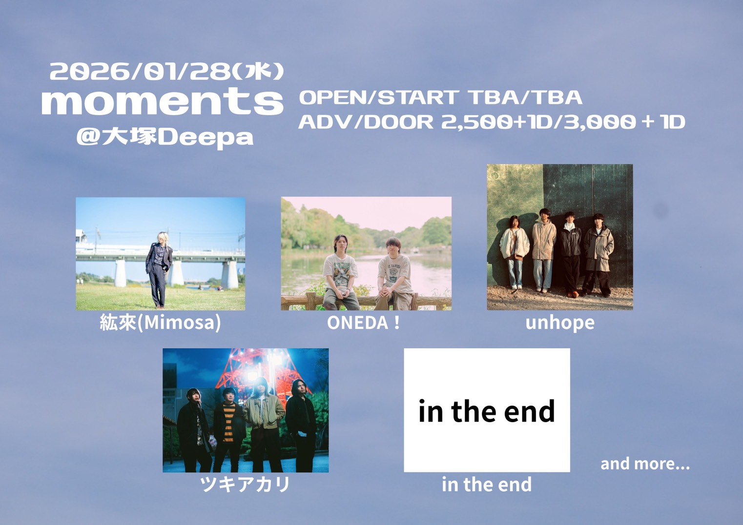 01.28(Wed) moments 3週連続企画 大塚Deepa X Facebook LINE コピー 2025.12.07 ACTONEDA! / 紘來(Mimosa) / ツキアカリ / in the end / unhope and more… イベント詳細 大塚Deepa|東京 大塚のライブハウスベースオントップグループのライブハウス『大塚Deepa』東京山手線大塚駅徒歩1分!!にあるライブハウス/クラブです。