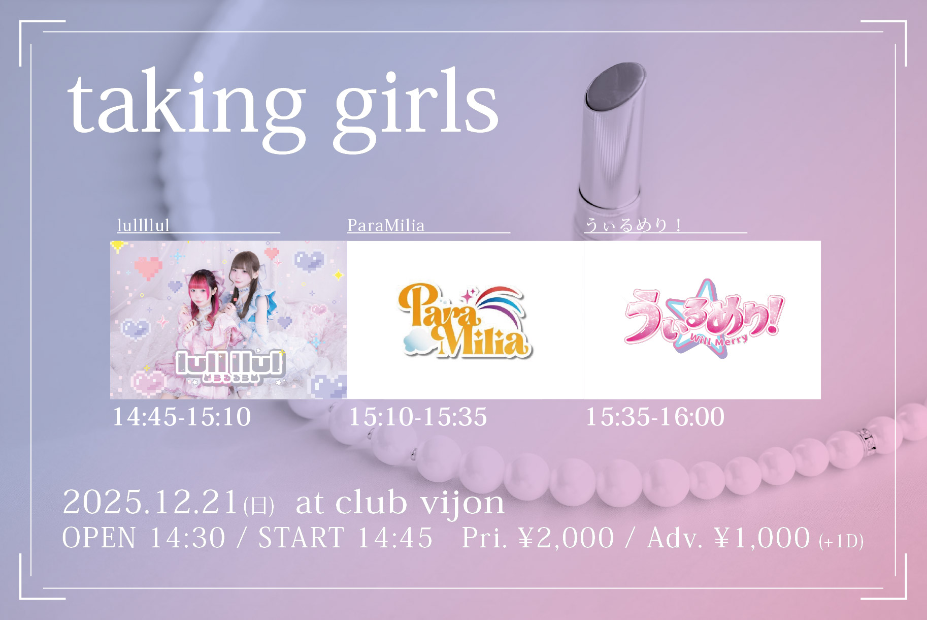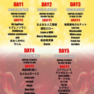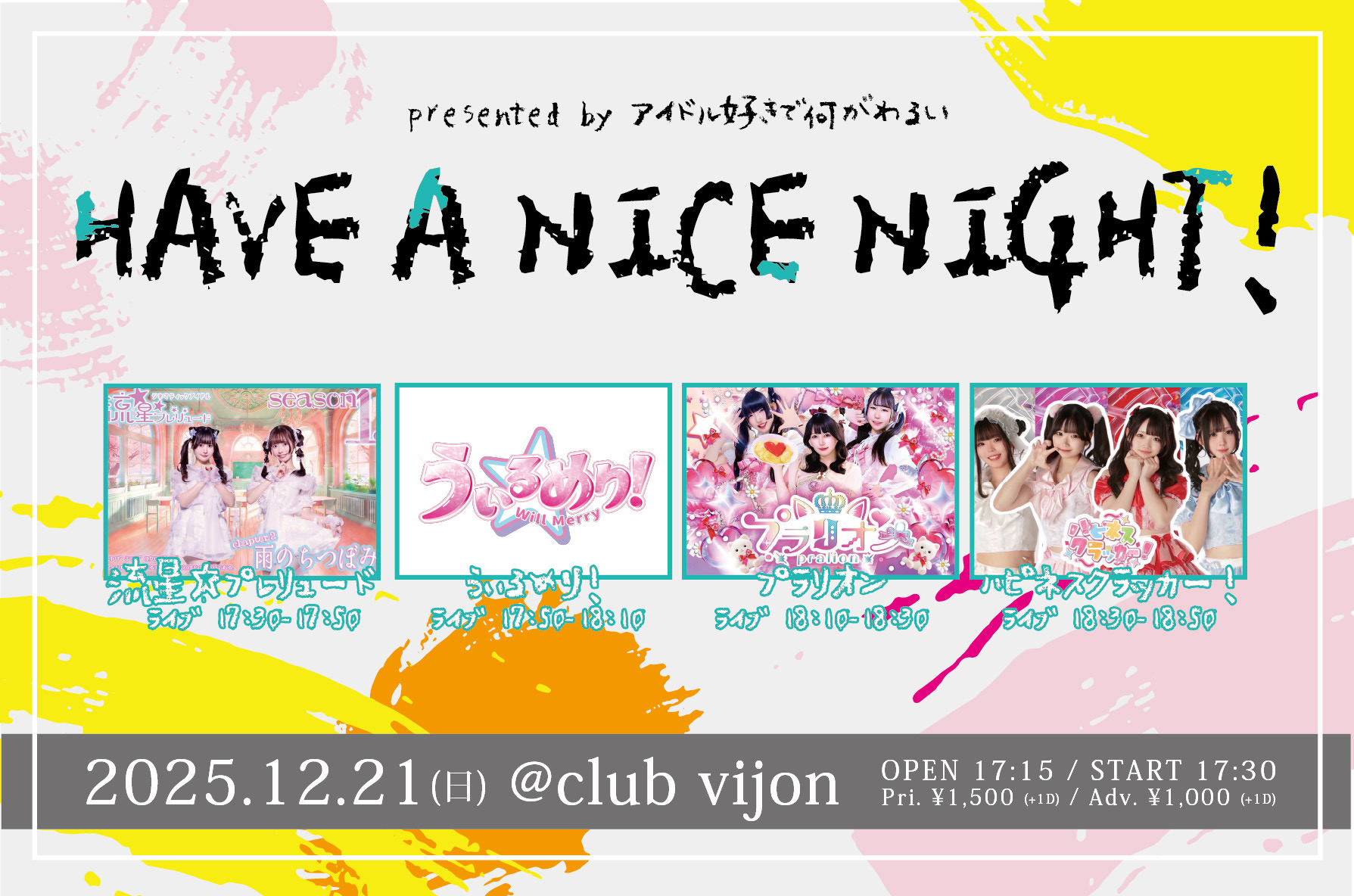 12.21(Sun) Haveanicenight 北堀江 club vijon X Facebook LINE コピー 2025.12.13 ACTうぃるめり! / ハピネスクラッカー! / プラリオン / 流星☆プレリュード イベント詳細 北堀江 club vijon(クラブビジョン)|大阪 北堀江のライブハウスベースオントップグループのライブハウス『北堀江club vijon』大阪北堀江にあるライブハウスです。