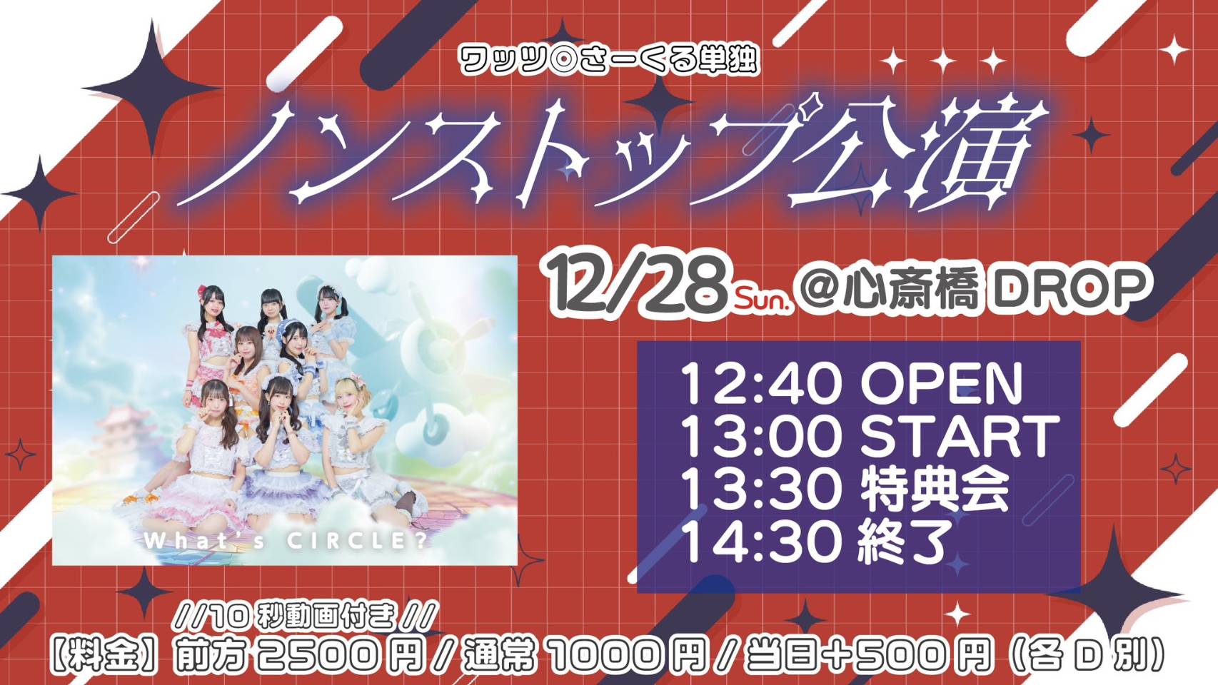 12.28(Sun) ワッツ◎さーくる単独「ノンストップ公演」 アメリカ村DROP X Facebook LINE コピー 2025.12.16 ACTワッツ◎さーくる イベント詳細 アメリカ村 DROP(ドロップ)|大阪 心斎橋アメ村のライブハウスベースオントップグループのライブハウス『アメリカ村 DROP(ドロップ)』大阪アメリカ村の中心地にあるライブハウスです。