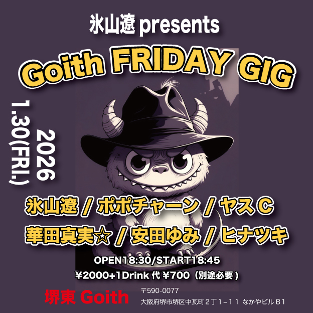 01.30(Fri) 氷山遼presents Goith FRIDAY GIG 堺東Goith X Facebook LINE コピー 2025.12.23 ACT 氷山遼 / ポポチャーン / ヤスC / 華田真実☆ / 安田ゆみ / ヒナツキ イベント詳細 堺東 Goith(ゴイス)|大阪 堺東のライブハウスベースオントップグループのライブハウス『堺東Goith』南海高野線の堺東からすぐの、粋なライブハウスです。
