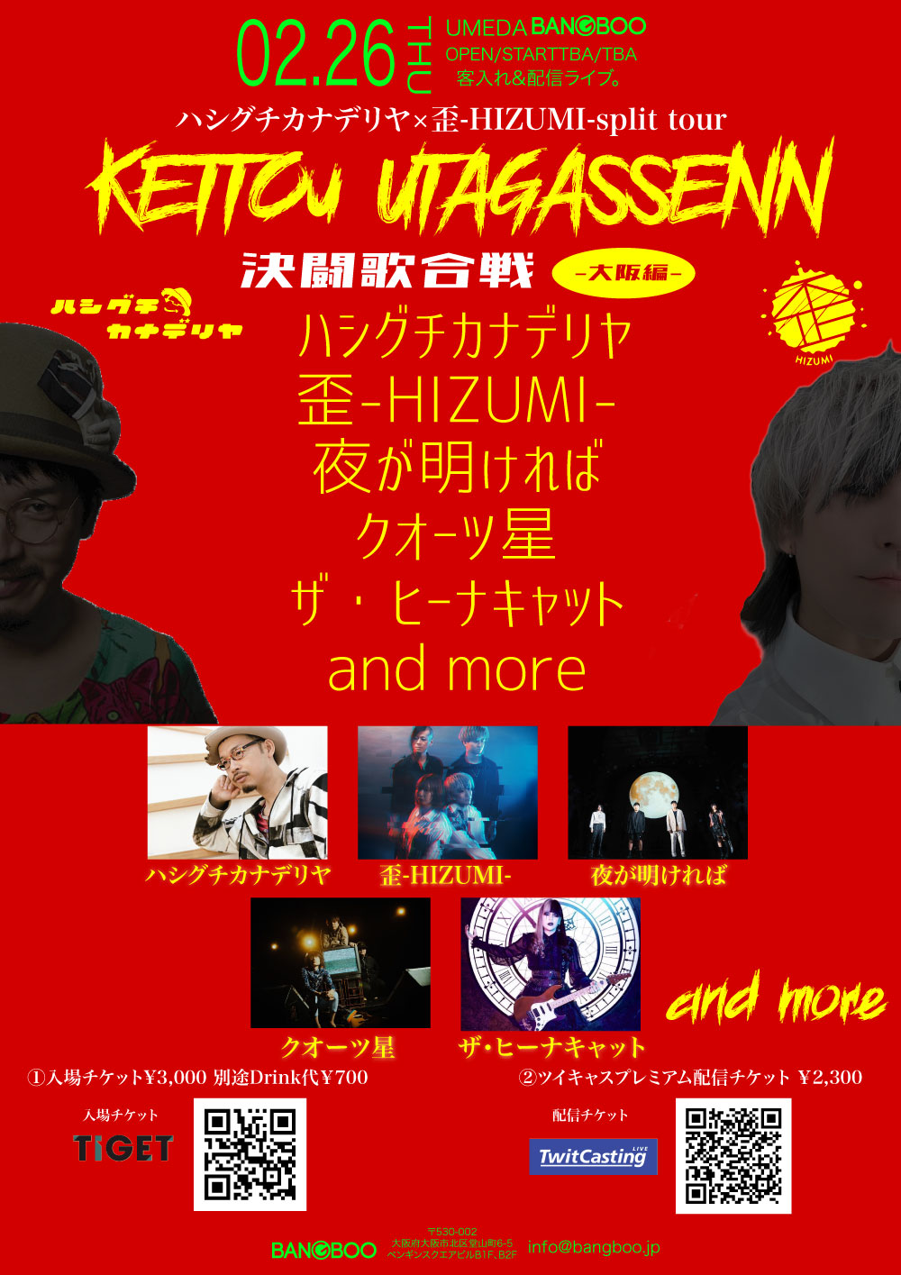 02.26(Thu) ハシグチカナデリヤ×歪-HIZUMI-split tour【決闘歌合戦】-大阪編-【配信あり】 梅田BANGBOO X Facebook LINE コピー 2025.12.23 ACT ハシグチカナデリヤ / 歪-HIZUMI- / 夜が明ければ / クオーツ星 / ザ・ヒーナキャット / and more イベント詳細 梅田 BANGBOOベースオントップグループのライブハウス『梅田 BANGBOO(ウメダバンブー)』大阪梅田にあるライブハウスです。
