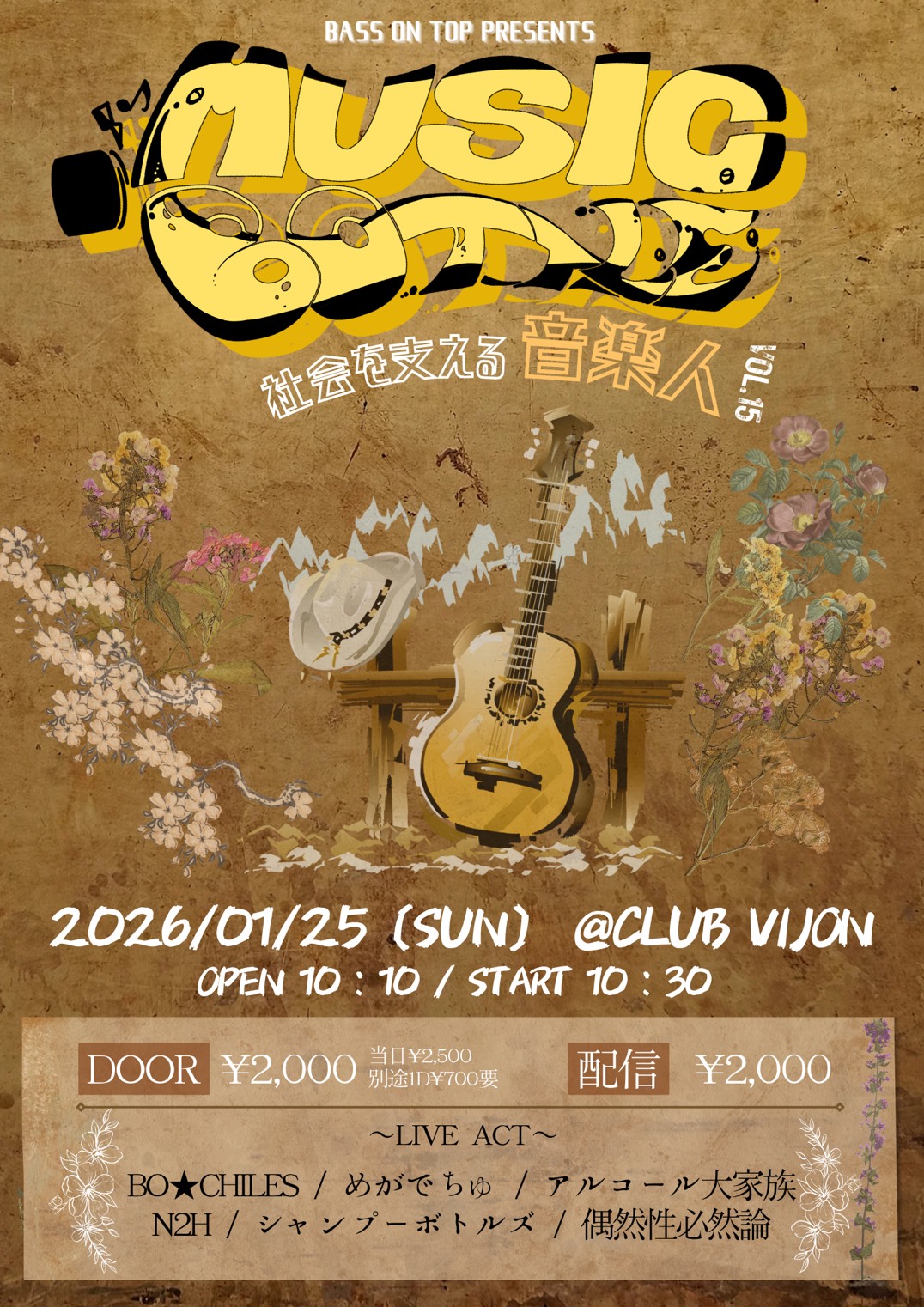 01.25(Sun) MUSIC BOTTLE 社会を支える音楽人 北堀江 club vijon X Facebook LINE コピー 2025.12.24 ACT BO★CHILEs / めがでちゅ / 偶然性必然論 / アルコール大家族 / シャンプーボトルズ / N2H イベント詳細 北堀江 club vijon(クラブビジョン)|大阪 北堀江のライブハウスベースオントップグループのライブハウス『北堀江club vijon』大阪北堀江にあるライブハウスです。