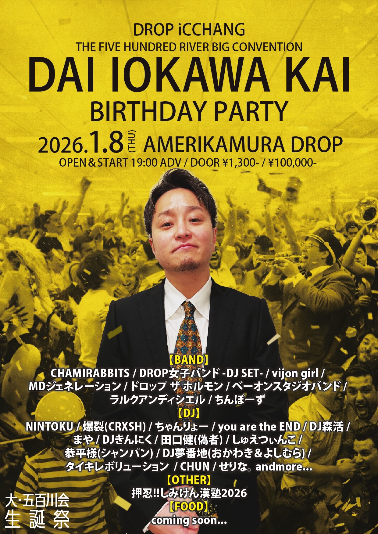 【BAND】 CHAMIRABBITS / DROP女子バンド -DJ SET- / vijon girl / MDジェネレーション / ドロップ ザ ホルモン / ベーオンスタジオバンド / ラルクアンディシエル / ちんぽーず 【DJ】 NINTOKU / 爆裂(CRXSH) / ちゃんりょー / you are the END / DJ森活 / まや / DJきんにく / 田口健(偽者) / しゅえつぃんこ / 恭平様(シャンパン) / DJ夢番地(おかわき&よしむら) / タイキレボリューション / CHUN / せりな。 andmore… 【OTHER】 押忍!!しみけん漢塾2026 【FOOD】 coming soon…