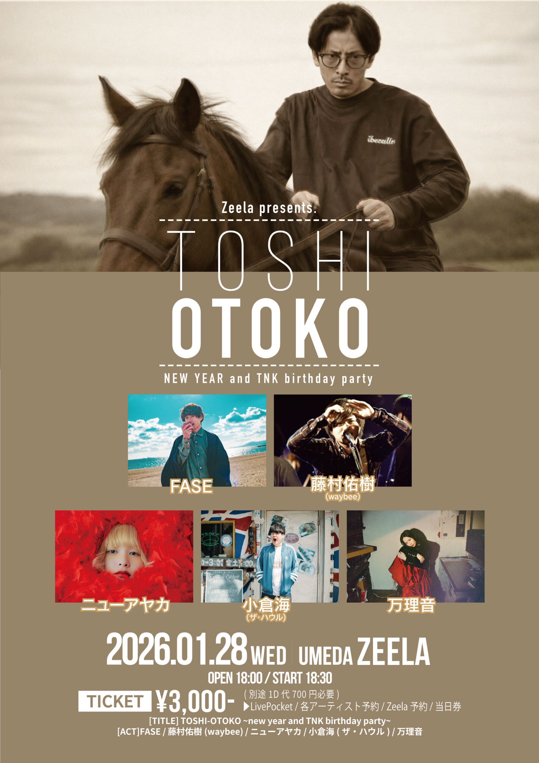 01.28(Wed) Zeela presents. TOSHI-OTOKO ~new year and TNK birthday party~ 梅田Zeela X Facebook LINE コピー 2026.01.08 ACT FASE / 藤村祐樹(waybee) / 小倉海(ザ・ハウル) / 万理音 / ニューアヤカ イベント詳細 梅田 Zeela|大阪 梅田のライブハウス大阪梅田のライブハウス Zeela(ジーラ)!ベースオントップグループ8軒目となるライブハウスです。