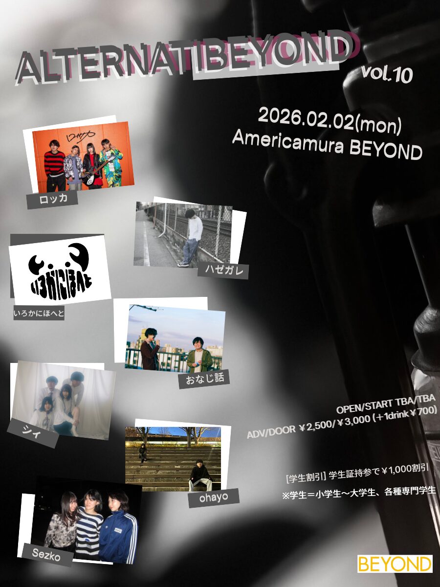 02.02(Mon) ALTERNATIBEYOND vol.10 アメリカ村BEYOND X Facebook LINE コピー 2026.01.08 ACT ロッカ(東京) / ハゼガレ / いろかにほへと / おなじ話 / シィ / ohayo / Sezko イベント詳細 アメリカ村 BEYONDベースオントップグループのライブハウス『アメリカ村 BEYOND(ビヨンド)』大阪アメリカ村の中心地にあるライブハウスです。