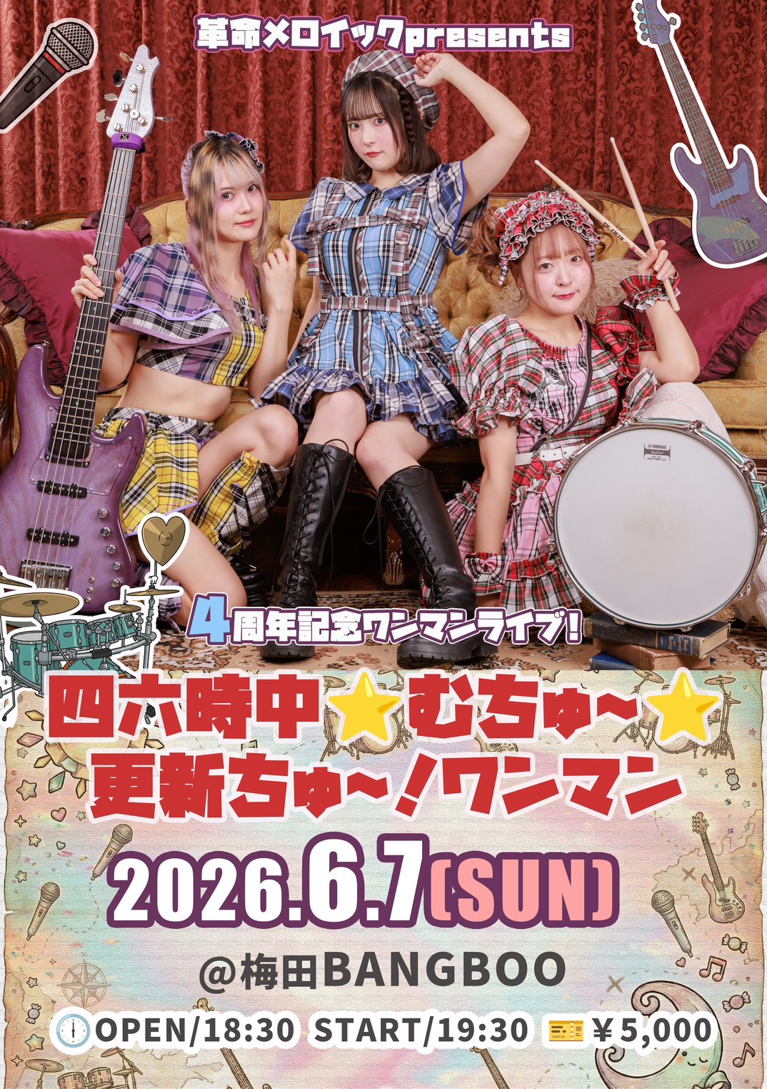 06.07(Sun) 革命メロイックpresents 4周年記念ワンマンライブ 『四六時中⭐むちゅ〜⭐更新ちゅ〜!ワンマン』 梅田BANGBOO X Facebook LINE コピー 2026.01.08 ACT 革命メロイック ワンマンライブ イベント詳細 梅田 BANGBOOベースオントップグループのライブハウス『梅田 BANGBOO(ウメダバンブー)』大阪梅田にあるライブハウスです。