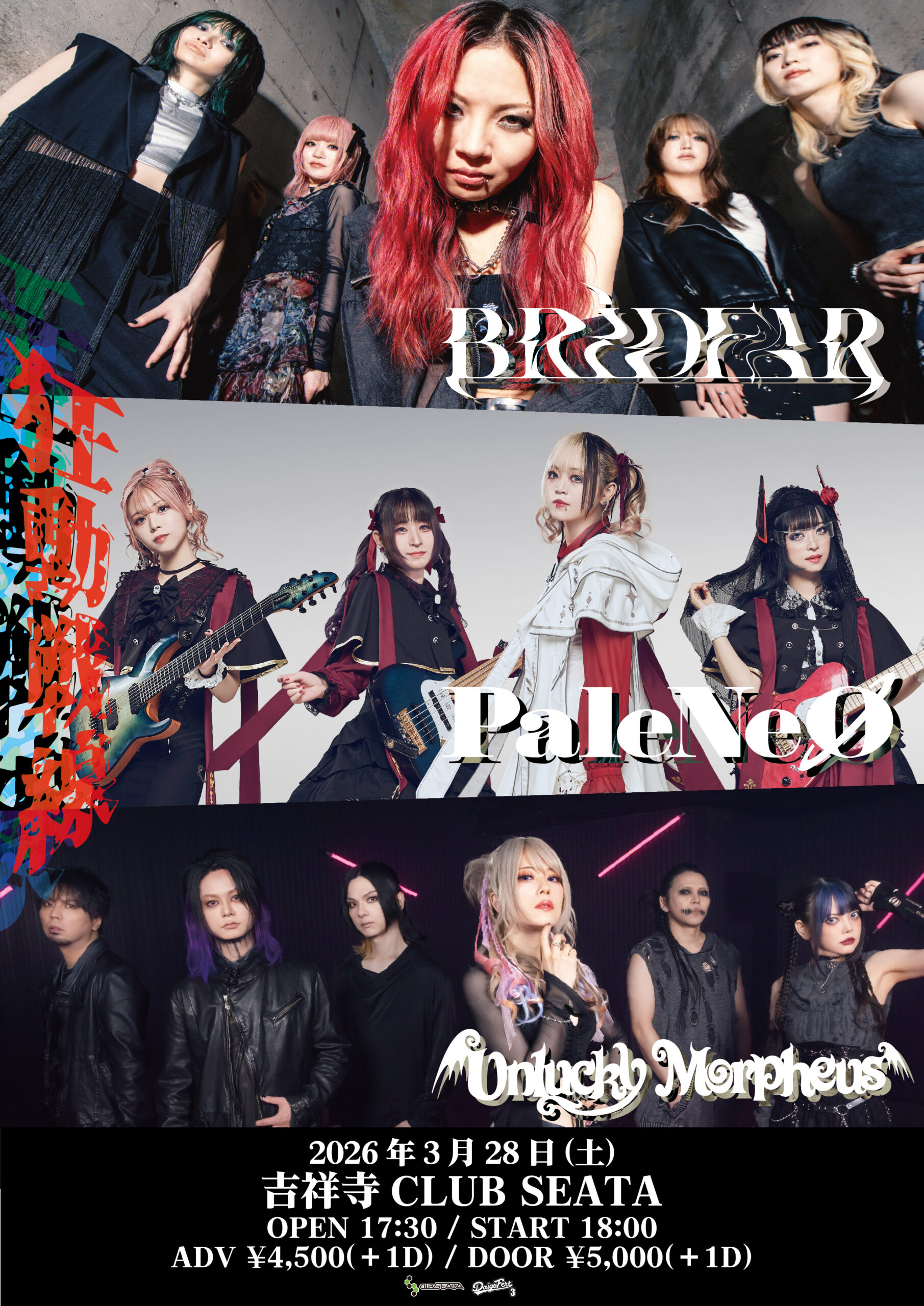 03.28(Sat) 狂動戦線 吉祥寺 CLUB SEATA X Facebook LINE コピー 2026.01.08 ACT BRIDEAR / PaleNeØ / Unlucky Morpheus イベント詳細 吉祥寺CLUB SEATA|東京 吉祥寺のライブハウス吉祥寺駅から徒歩5分、西東京最大級のライブハウス/CLUB!誰もが想像し得なかった吉祥寺という場所に新たなプレイスポットが誕生!都内のライブシーン・クラブシーンに新たな風を創るCLUB SEATA