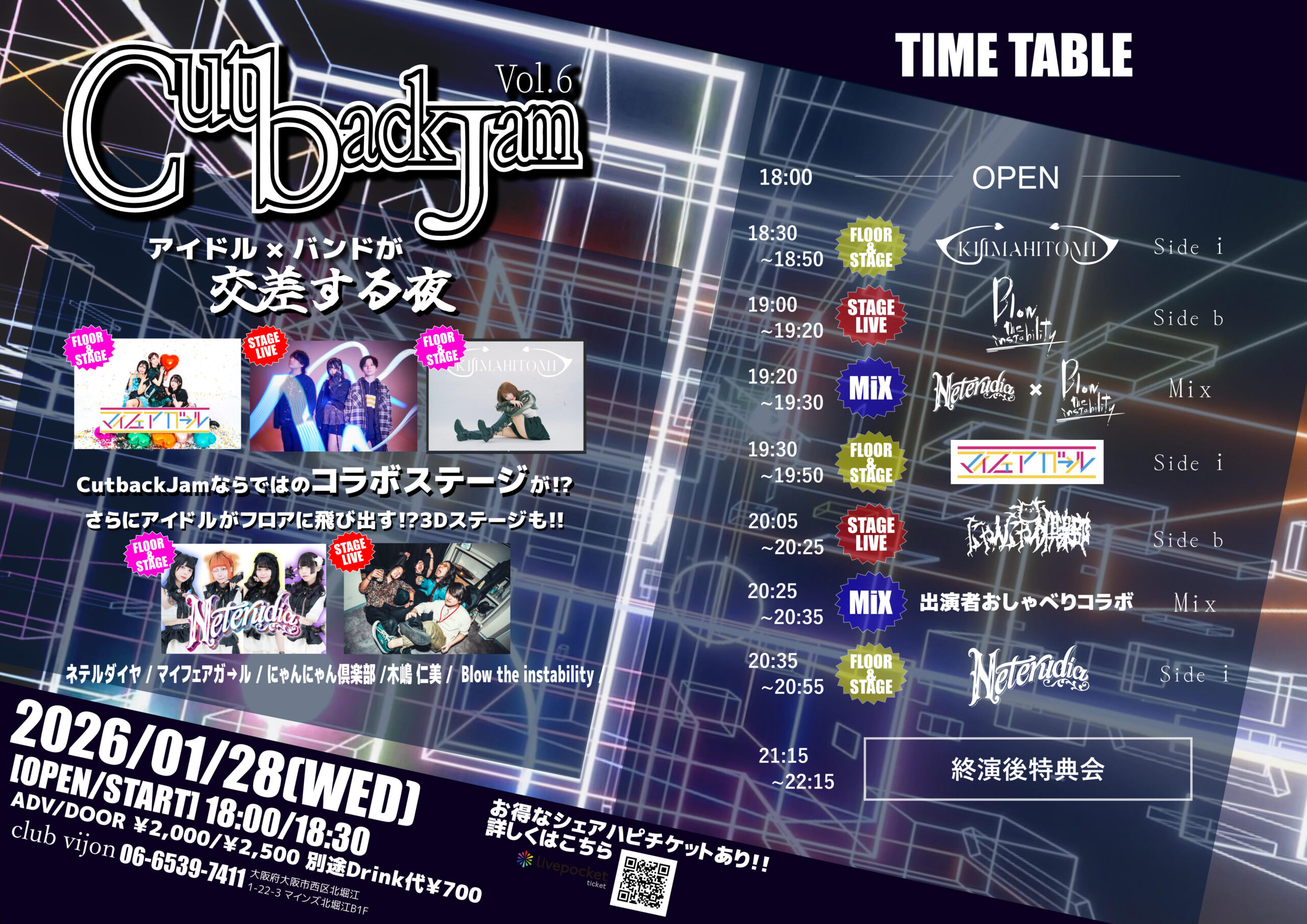 01.28(Wed) 【Cutback jam Vol.6】【配信あり】 北堀江 club vijon X Facebook LINE コピー 2026.01.10 ACT ネテルダイヤ / マイフェアガ→ル / にゃんにゃん倶楽部 / Blow the instability / 木嶋 仁美 イベント詳細 北堀江 club vijon(クラブビジョン)|大阪 北堀江のライブハウスベースオントップグループのライブハウス『北堀江club vijon』大阪北堀江にあるライブハウスです。