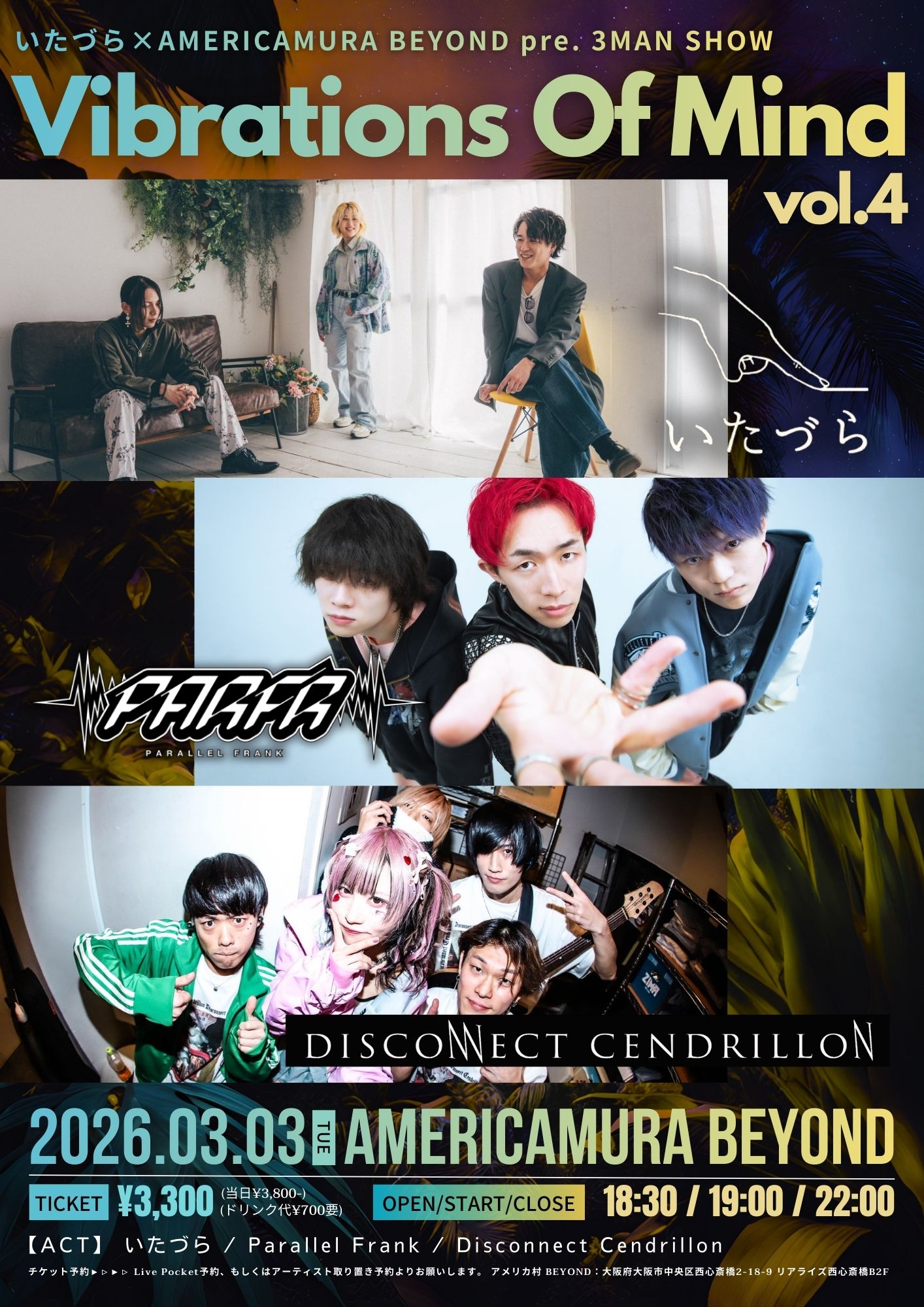 03.03(Tue) いたづら×AMERICAMURA BEYOND pre. Vibrations Of Mind vol.4 アメリカ村BEYOND X Facebook LINE コピー 2026.01.13 ACT いたづら / Parallel Frank / Disconnect Cendrillon イベント詳細 アメリカ村 BEYONDベースオントップグループのライブハウス『アメリカ村 BEYOND(ビヨンド)』大阪アメリカ村の中心地にあるライブハウスです。