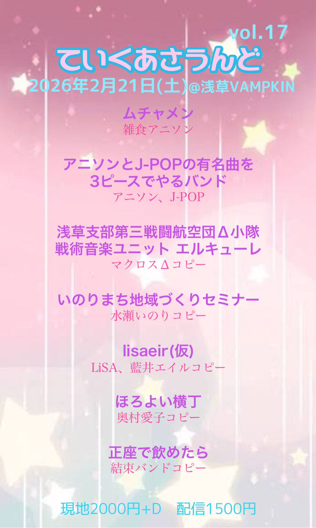 浅草VAMPKINムチャメン / あにそんとJ-POPの有名曲を3ピースでやるバンド / 浅草支部第三戦闘航空団Δ小隊 戦術音楽ユニット エルキューレ / いのりまち地域づくりセミナー / lisaeir(仮) / ほろよい横丁 / 正座で飲めたら