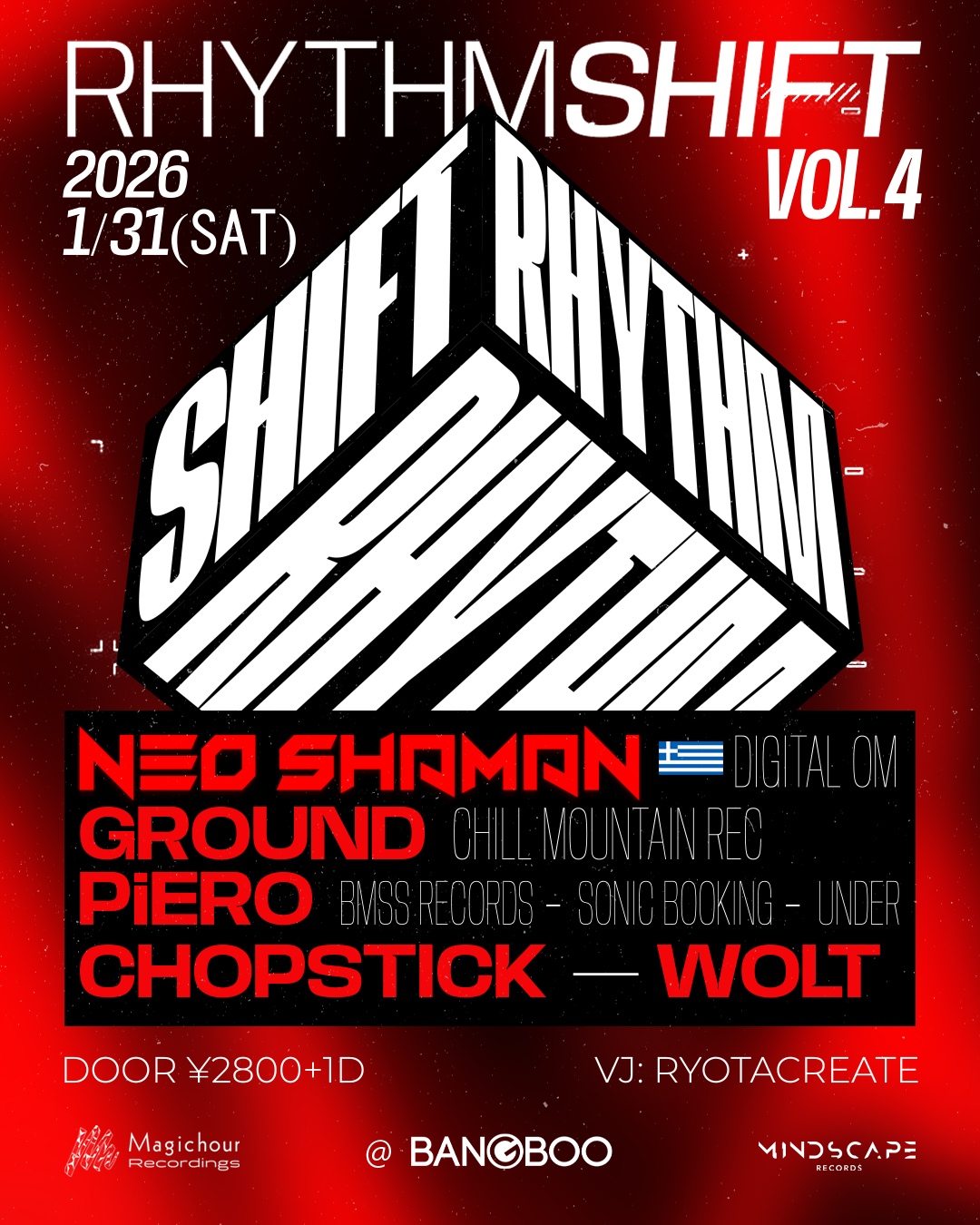 【Guest Artist】Neo Shaman (Digital Om)?? 【Guest DJ】 Ground (Chill Mountain Rec) PiERO(BMSS Records/Sonic Booking/UNDER ) 【RHYTHM SHIFT DJs】Chopstick (Mindscape Records)WOLT (Magichour Recordings) 【VJ】 Ryotacreate
