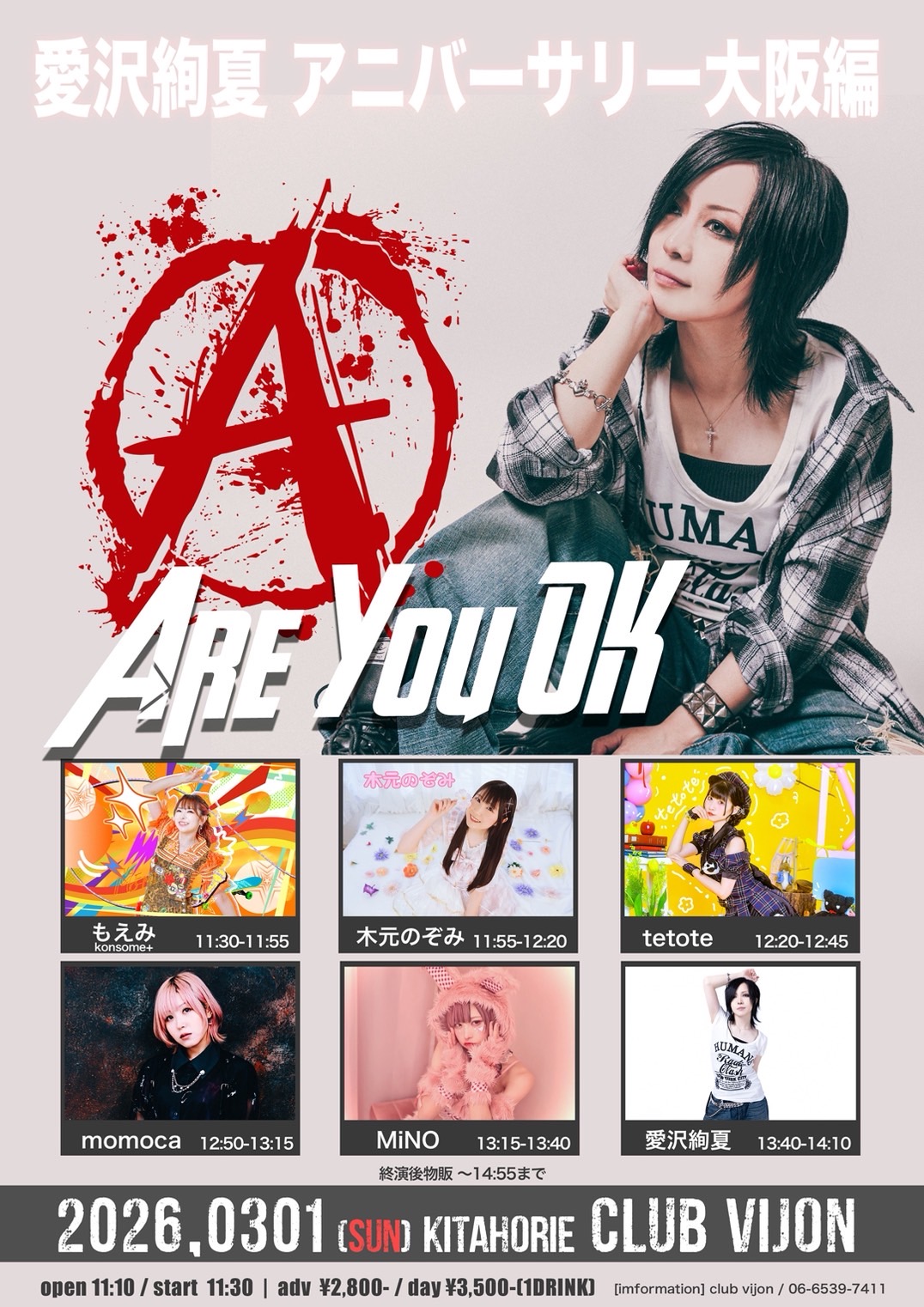 03.01(Sun) AIZAWA AYAKA Anniversary event 2026 「ARE YOU OK in 大阪」 バンド・弾き語り X Facebook LINE コピー 2026.01.24 ACT 愛沢絢夏 / MiNO / momoca / もえみ(KONSOME+)/ tetote / 木元のぞみ イベント詳細 北堀江 club vijon(クラブビジョン)|大阪 北堀江のライブハウスベースオントップグループのライブハウス『北堀江club vijon』大阪北堀江にあるライブハウスです。
