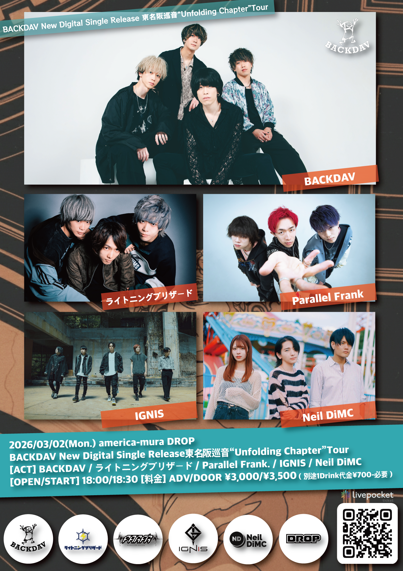 03.02(Mon) BACKDAV New Digital Single Release東名阪巡音“Unfolding Chapter”Tour アメリカ村DROP X Facebook LINE コピー 2026.01.26 ACT BACKDAV / ライトニングブリザード / Parallel Frank. / IGNIS / Neil DiMC イベント詳細 アメリカ村 DROP(ドロップ)|大阪 心斎橋アメ村のライブハウスベースオントップグループのライブハウス『アメリカ村 DROP(ドロップ)』大阪アメリカ村の中心地にあるライブハウスです。