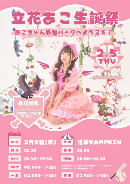 02.05(Thu) 立花あこ生誕祭~あこちゃん最強パークへようこそ~ 浅草VAMPKIN X Facebook LINE コピー 2026.01.27 ACT ひめもすオーケストラ イベント詳細 浅草 VAMPKINベースオントップグループのライブハウス『浅草 VAMPKIN(アサクサ ヴァンプキン)』東京浅草にあるライブハウスです。