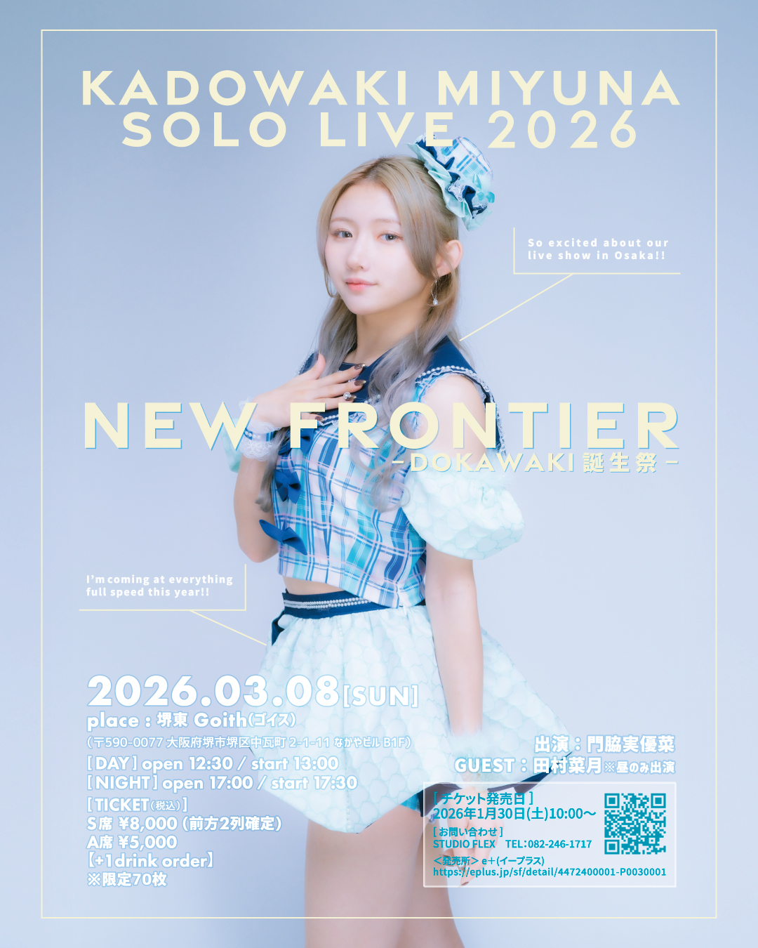 03.08(Sun) KADOWAKI MIYUNA solo live 2026 New Frontier ~DOKAWAKI 誕生祭~ 堺東Goith X Facebook LINE コピー 2026.02.01 ACT 門脇実優菜 イベント詳細 【DAY】 堺東 Goith(ゴイス)|大阪 堺東のライブハウスベースオントップグループのライブハウス『堺東Goith』南海高野線の堺東からすぐの、粋なライブハウスです。 【NIGHT】 堺東 Goith(ゴイス)|大阪 堺東のライブハウスベースオントップグループのライブハウス『堺東Goith』南海高野線の堺東からすぐの、粋なライブハウスです。