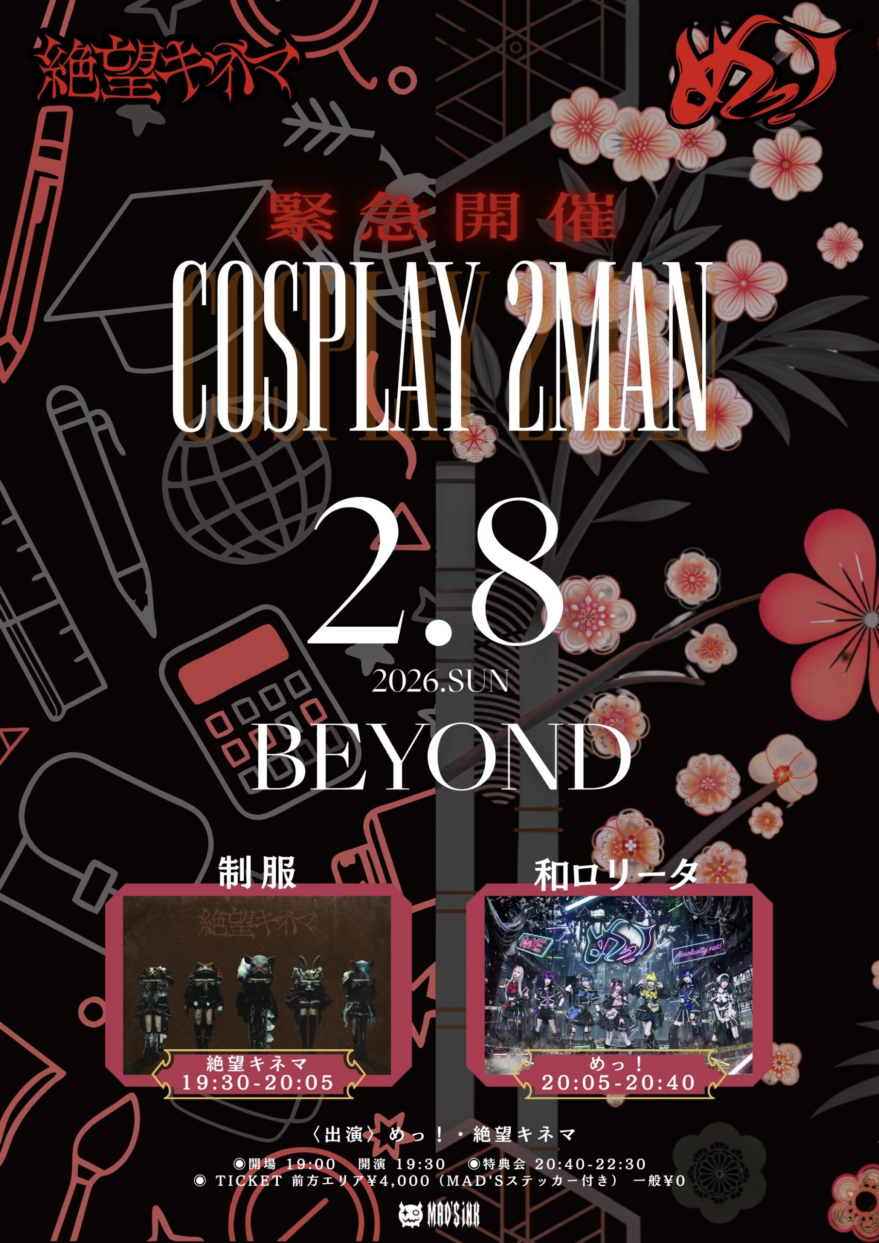 02.08(Sun) めっ!×絶望キネマ『COSPLAY 2MAN』 アメリカ村BEYOND X Facebook LINE コピー 2026.02.01 ACT めっ! / 絶望キネマ イベント詳細 アメリカ村 BEYONDベースオントップグループのライブハウス『アメリカ村 BEYOND(ビヨンド)』大阪アメリカ村の中心地にあるライブハウスです。