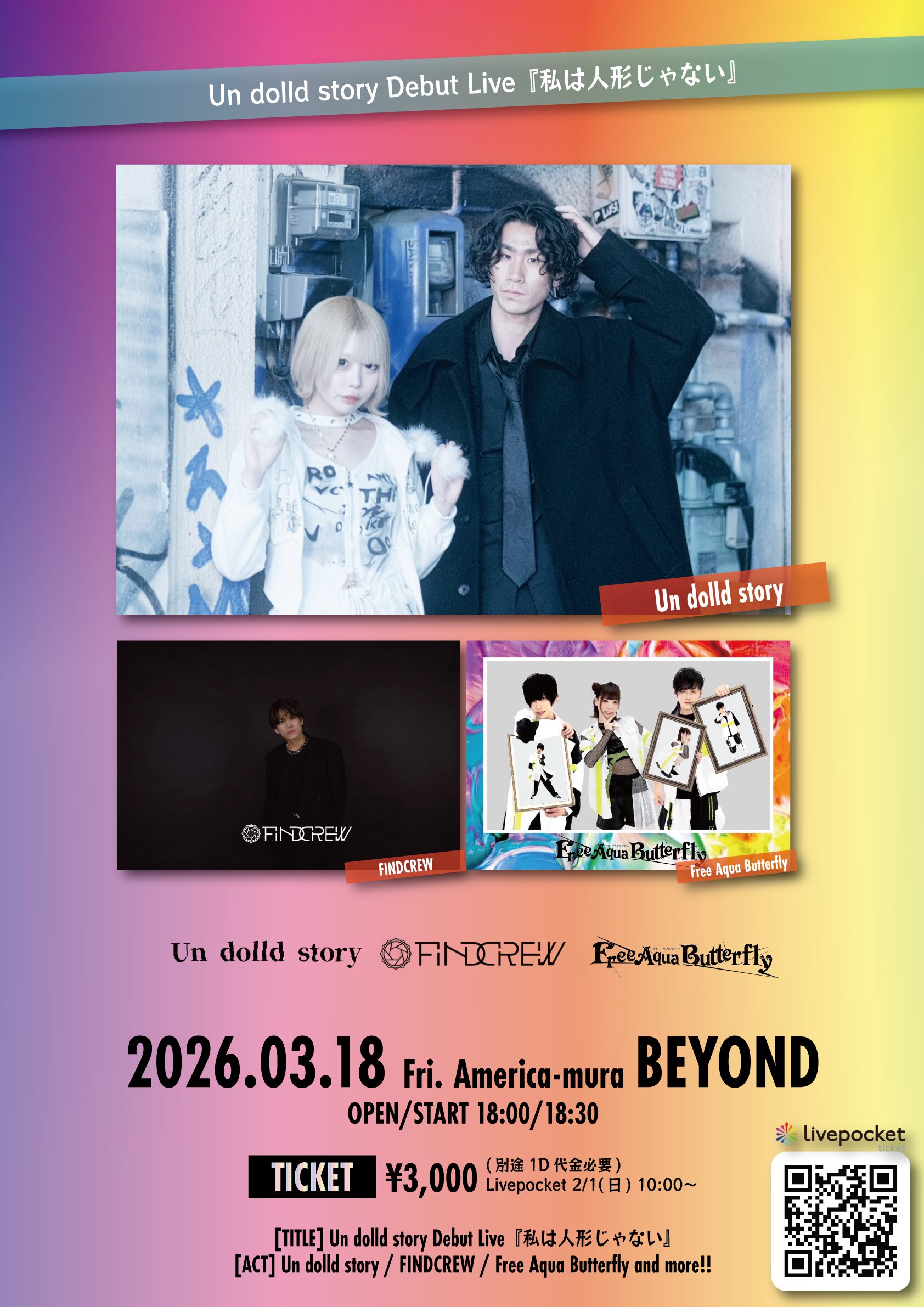 03.18(Wed) Un dolld story Debut Live『私は人形じゃない』 アメリカ村BEYOND X Facebook LINE コピー 2026.02.01 ACT Un dolld story / FINDCREW / Free Aqua Butterfly and more!! イベント詳細 アメリカ村 BEYONDベースオントップグループのライブハウス『アメリカ村 BEYOND(ビヨンド)』大阪アメリカ村の中心地にあるライブハウスです。