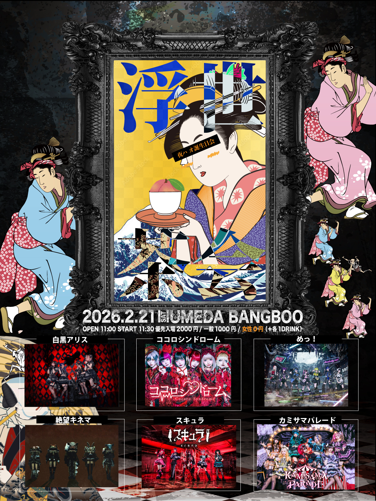 02.21(Sat) 浮世茶会 – 姫柊あんず生誕前茶会 – 梅田BANGBOO X Facebook LINE コピー 2026.02.01 ACT 白黒アリス / めっ! / 絶望キネマ / ココロシンドローム / カミサマパレード / スキュラ イベント詳細 梅田 BANGBOOベースオントップグループのライブハウス『梅田 BANGBOO(ウメダバンブー)』大阪梅田にあるライブハウスです。