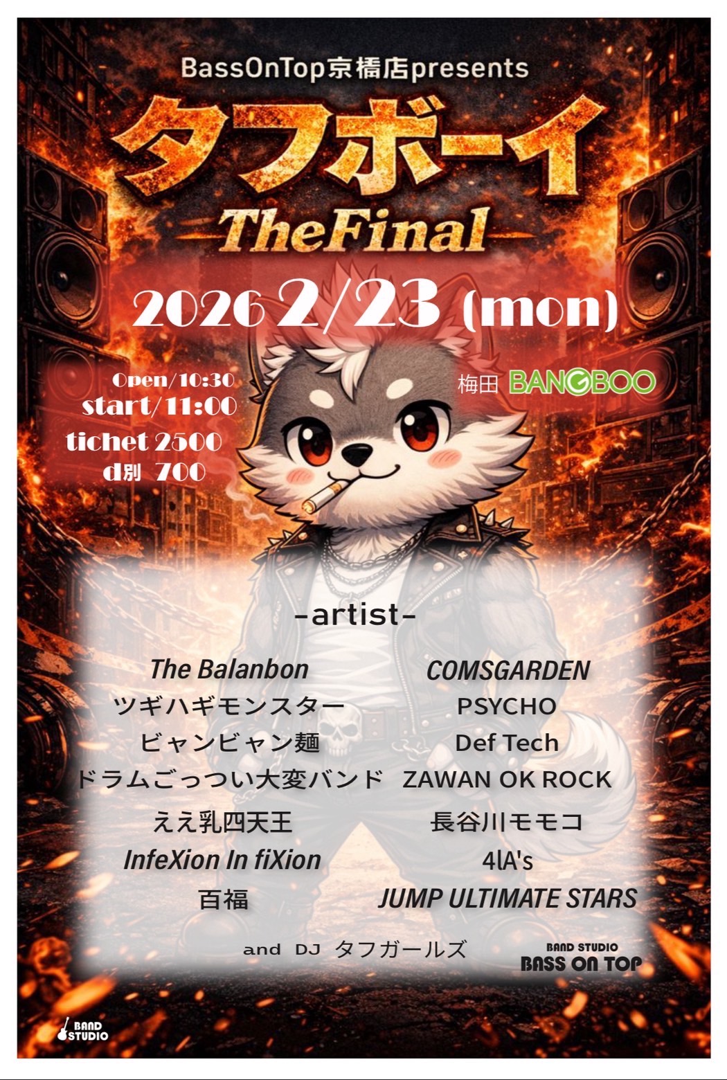 The Balanbon / ツギハギモンスター / ビャンビャン麺 / ドラムごっつい大変バンド / ええ乳四天王 / InfeXion In fiXion / 百福 / COMSGARDEN / PSYCHO / Def Tech / ZAWAN OK ROCK / 4lA’s / 長谷川モモコ / JUMP ULTIMATE STARS
