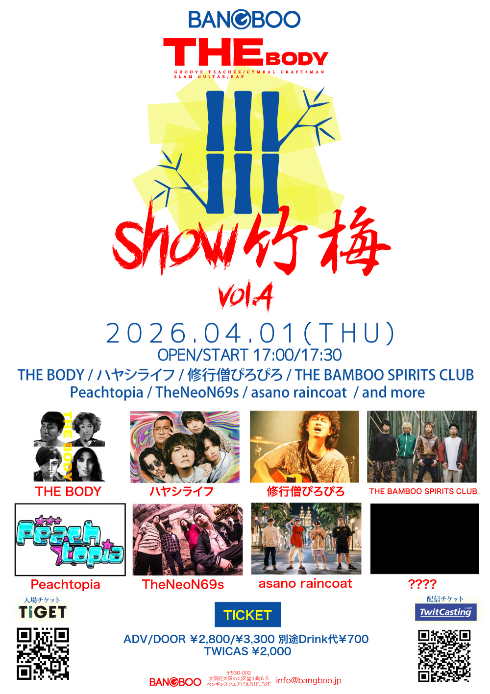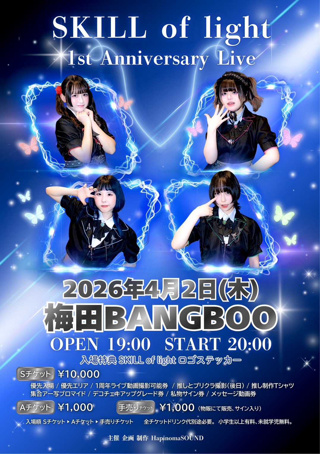 04.02(Thu) 【SKILL of light 1st Anniversary Live】【配信あり】 梅田BANGBOO X Facebook LINE コピー 2026.02.01 ACT SKILL of light イベント詳細 梅田 BANGBOOベースオントップグループのライブハウス『梅田 BANGBOO(ウメダバンブー)』大阪梅田にあるライブハウスです。