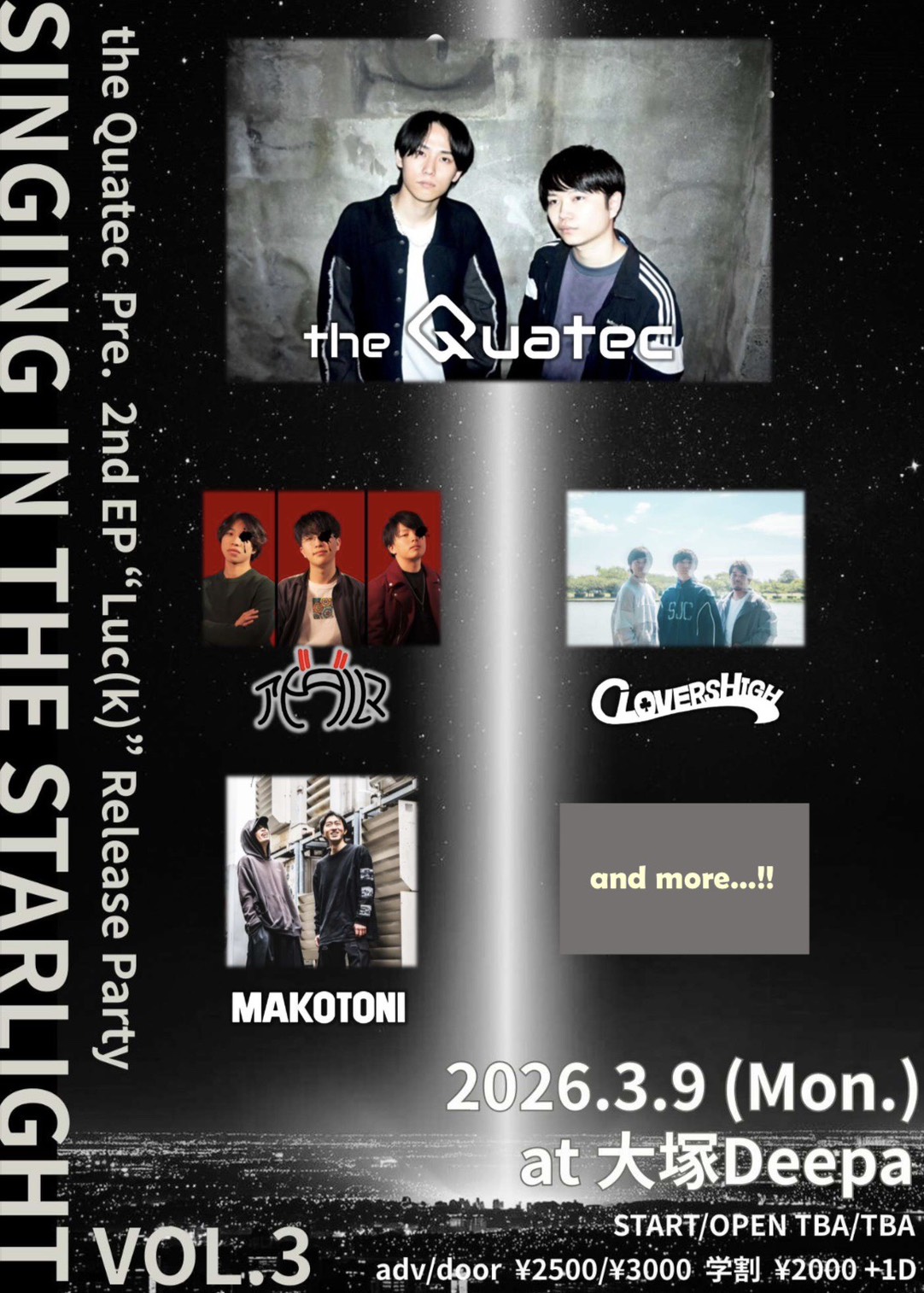 03.09(Mon) the Quatec pre. 2nd EP 『Luc(k)』 Release Party “SINGING IN THE STARLIGHT VOL.3” 大塚Deepa X Facebook LINE コピー 2026.02.01 ACT the Quatec / CLOVERS HIGH / アビダルマ / MAKOTONI and more… イベント詳細 大塚Deepa|東京 大塚のライブハウスベースオントップグループのライブハウス『大塚Deepa』東京山手線大塚駅徒歩1分!!にあるライブハウス/クラブです。