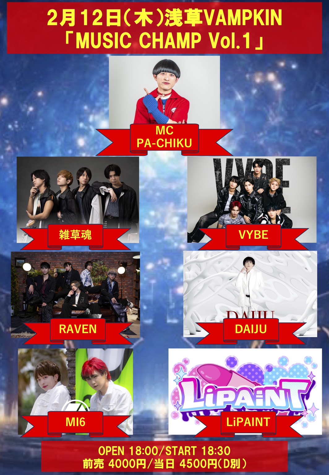 02.12(Thu) MUSIC CHAMP Vol.1 浅草VAMPKIN X Facebook LINE コピー 2026.02.01 ACT MC PA-CHIKU 出演/RAVEN/MI6/VYBE/DAIJU/LiPAINT/雑草魂 イベント詳細 浅草 VAMPKINベースオントップグループのライブハウス『浅草 VAMPKIN(アサクサ ヴァンプキン)』東京浅草にあるライブハウスです。