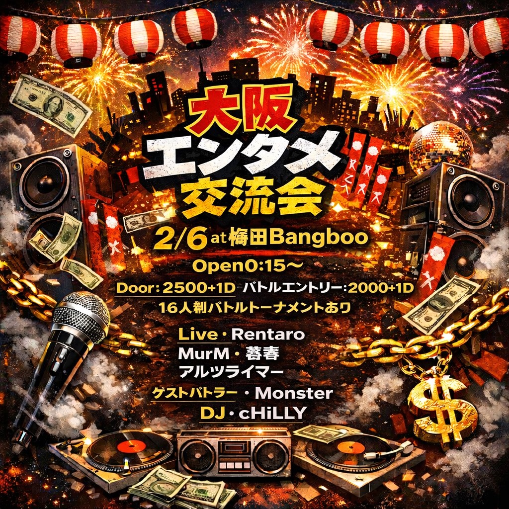 02.06(Fri) 大阪エンタメ交流会 梅田BANGBOO X Facebook LINE コピー 2026.02.05 ACT Rentaro / MurM / 暮春 / アルツライマー / Monster / cHiLLy イベント詳細 梅田 BANGBOOベースオントップグループのライブハウス『梅田 BANGBOO(ウメダバンブー)』大阪梅田にあるライブハウスです。
