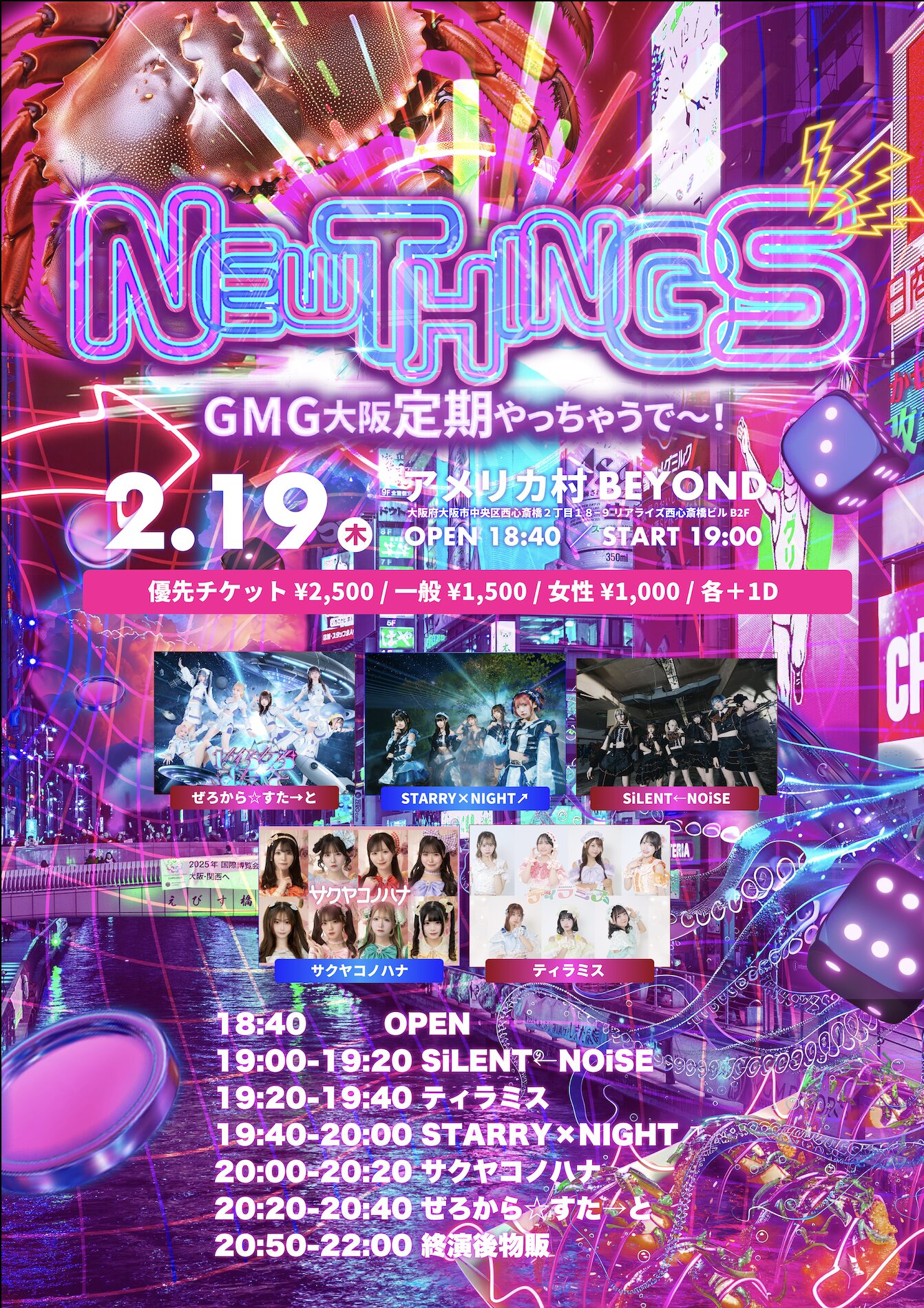 02.19(Thu) NEW THINGS アメリカ村BEYONDScreenshot X Facebook LINE コピー 2026.02.06 ACT STARRY×NiGHT↗ / ぜろから☆すた→と / SiLENT←NOiSE / サクヤコノハナ / ティラミス イベント詳細 アメリカ村 BEYONDベースオントップグループのライブハウス『アメリカ村 BEYOND(ビヨンド)』大阪アメリカ村の中心地にあるライブハウスです。