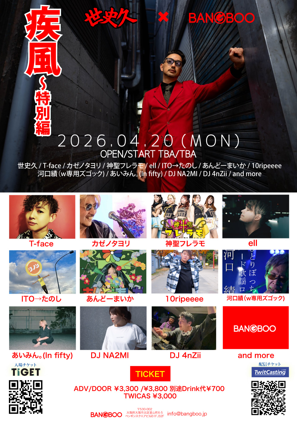 梅田BANGBOO世史久 / T-face / カゼノタヨリ / 神聖フレラモ / ell / ITO→たのし / あんどーまいか / 10ripeeee / 河口績(w専用ズゴック) / あいみん。(In fifty) / DJ NA2MI / DJ 4NZ / and more
