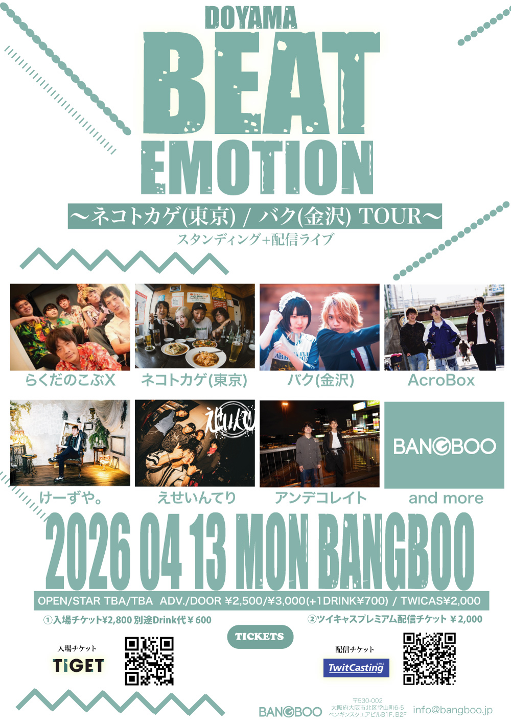 04.13(Mon) 【DOYAMA BEAT EMOTION】〜ネコトカゲ(東京) / バク(金沢) TOUR〜【配信あり】 梅田BANGBOO X Facebook LINE コピー 2026.02.08 ACT らくだのこぶX / ネコトカゲ(東京) / バク(金沢) / AcroBox / けーずや。 / えせいんてり / アンデコレイト イベント詳細 梅田 BANGBOOベースオントップグループのライブハウス『梅田 BANGBOO(ウメダバンブー)』大阪梅田にあるライブハウスです。