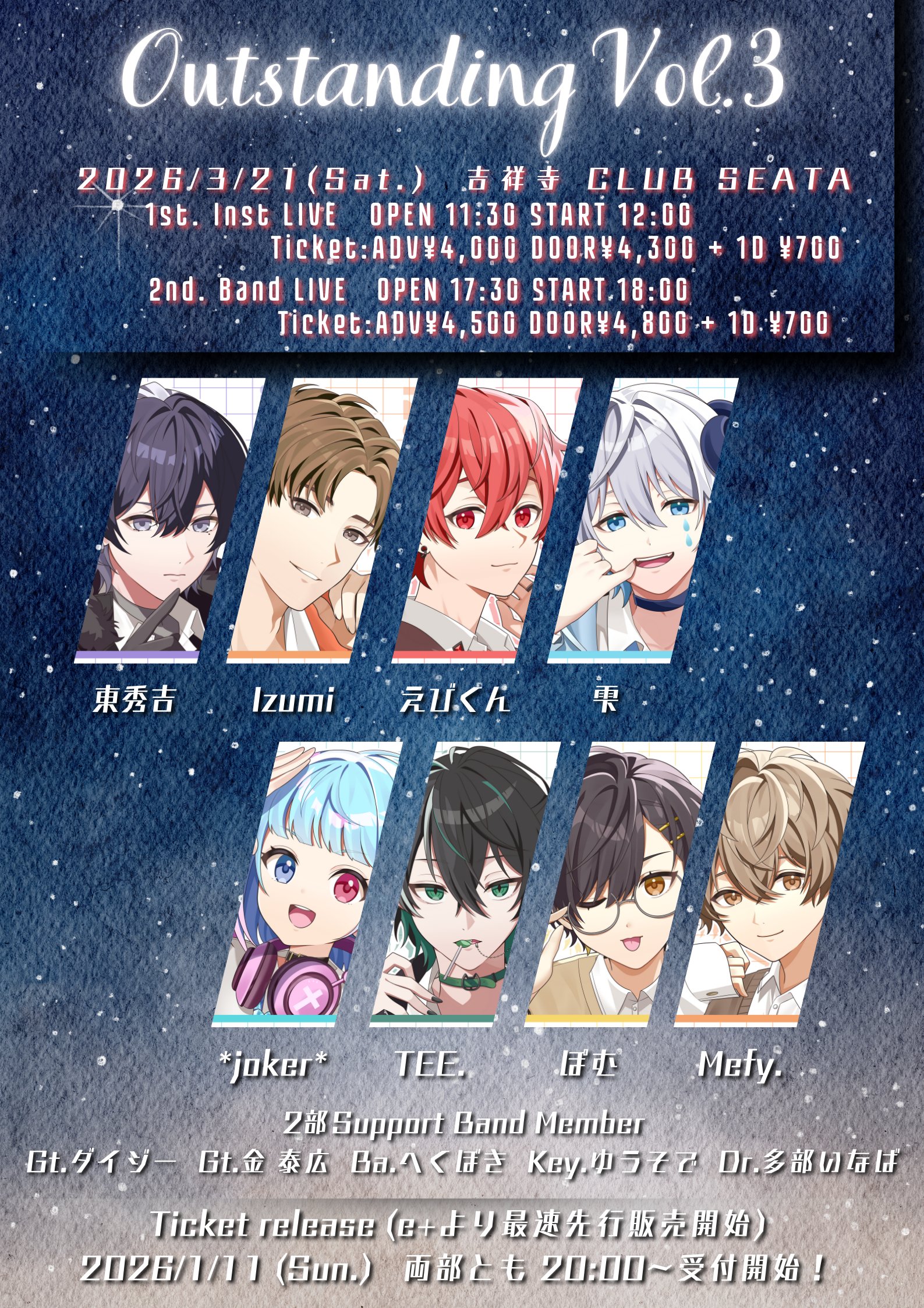 東秀吉/Izumi/えびくん/雫/*joker*/TEE./ぽむ/Mefy. Gt.ダイジー Gt.金泰広 Ba.へくぼき Dr.多部いなば Key.ゆうそで