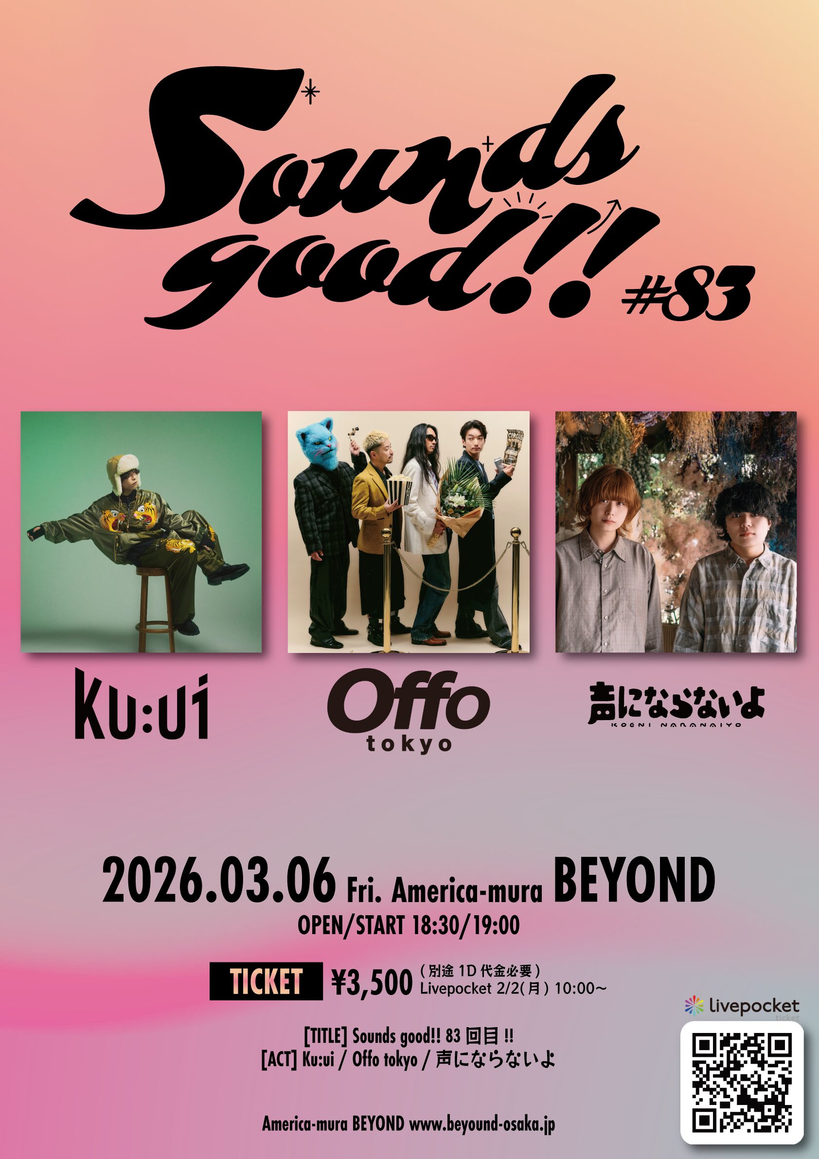 03.06(Fri) Sounds good!! 83回目!! アメリカ村BEYOND X Facebook LINE コピー 2026.02.10 ACT Ku:ui / Offo tokyo / 声にならないよ イベント詳細 アメリカ村 BEYONDベースオントップグループのライブハウス『アメリカ村 BEYOND(ビヨンド)』大阪アメリカ村の中心地にあるライブハウスです。