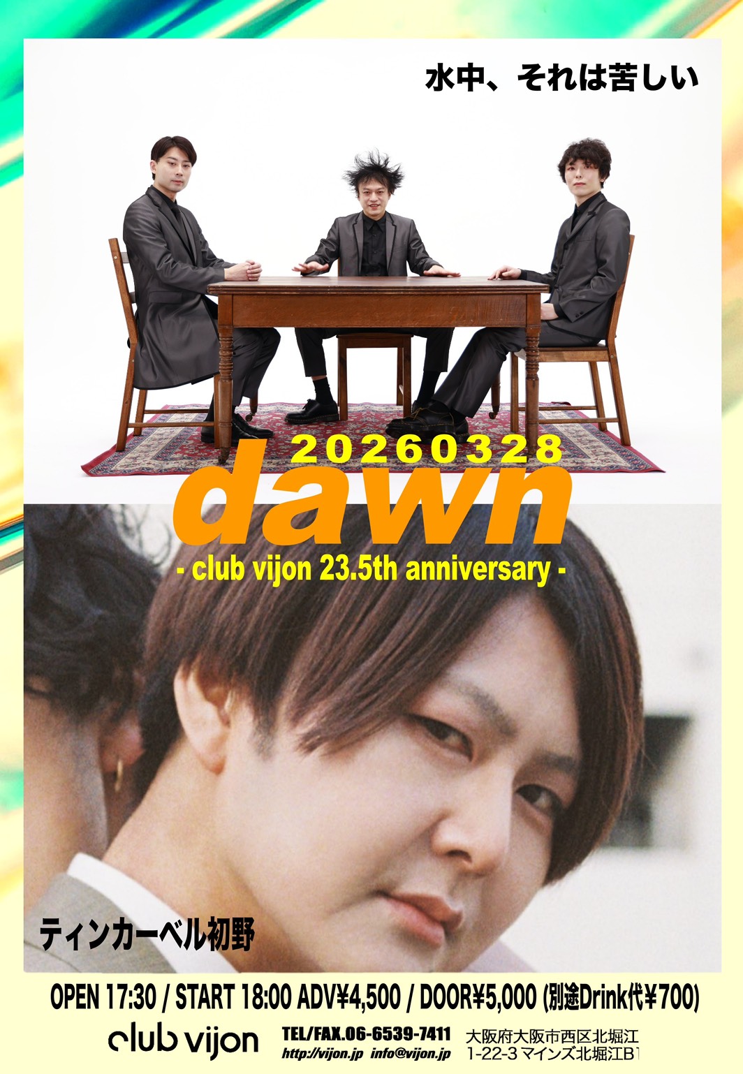 03.28(Sat) 【dawn】 – club vijon 23.5th anniversary – 北堀江 club vijon X Facebook LINE コピー 2026.02.14 ACT 水中、それは苦しい / ティンカーベル初野 イベント詳細 北堀江 club vijon(クラブビジョン)|大阪 北堀江のライブハウスベースオントップグループのライブハウス『北堀江club vijon』大阪北堀江にあるライブハウスです。