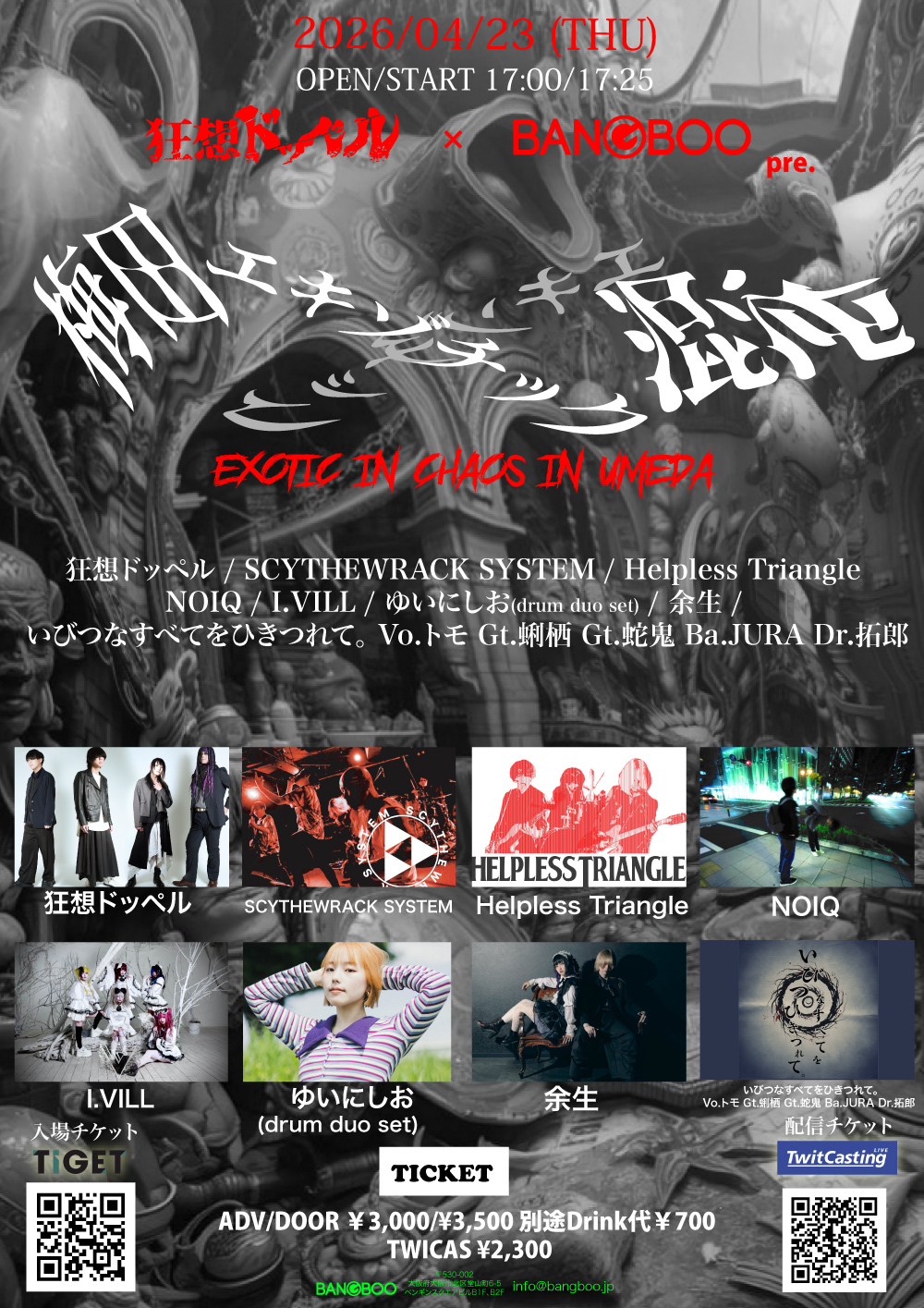 梅田BANGBOO狂想ドッペル / SCYTHEWRACK SYSTEM / Helpless Triangle / NOIQ / I.VILL / ゆいにしお(drum duo set) / 余生 / いびつなすべてをひきつれて。 Vo.トモ Gt.蜊栖 Gt.蛇鬼 Ba.JURA Dr.拓郎