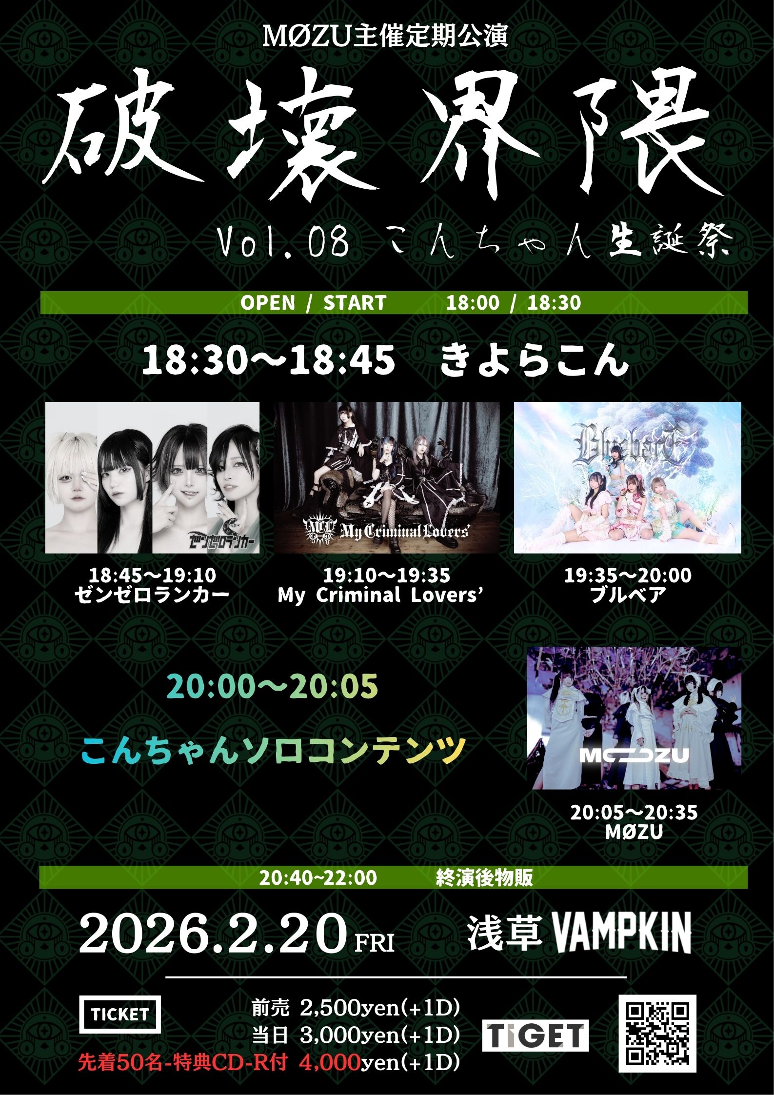 02.20(Fri) MØZU主催定期 ”破壊界隈” Vol.8 ~こんちゃん生誕祭~ 浅草VAMPKIN X Facebook LINE コピー 2026.02.14 ACT きよらこん ゼンゼロランカー My Criminal Lovers’ ブルベア こんちゃんソロ MØZU イベント詳細 浅草 VAMPKINベースオントップグループのライブハウス『浅草 VAMPKIN(アサクサ ヴァンプキン)』東京浅草にあるライブハウスです。