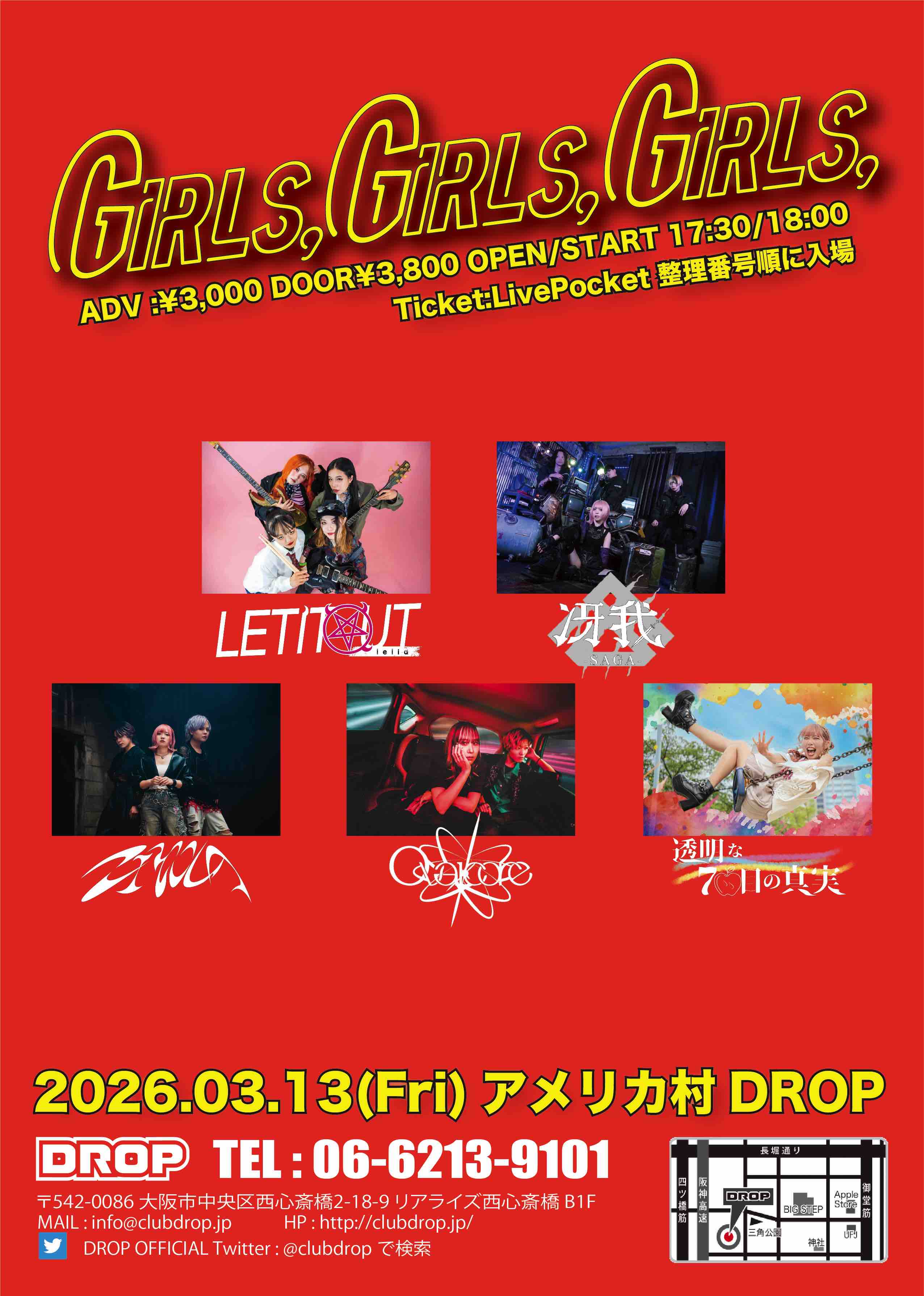 03.13(Fri) Girls,Girls,Girls, アメリカ村DROP X Facebook LINE コピー 2026.02.16 ACT LETITOUT-lelia- / 冴我 / ZIYOLA / Ovalcore / 透明な7日目の真実 イベント詳細 アメリカ村 DROP(ドロップ)|大阪 心斎橋アメ村のライブハウスベースオントップグループのライブハウス『アメリカ村 DROP(ドロップ)』大阪アメリカ村の中心地にあるライブハウスです。