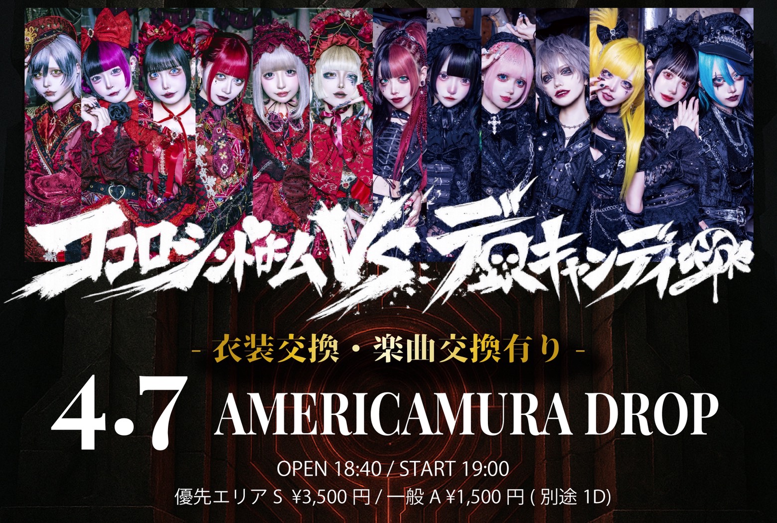 04.07(Tue) マギマギpresents『ココロシンドローム VS デスキャンディ』 アメリカ村DROP X Facebook LINE コピー 2026.02.16 ACT ココロシンドローム / デスキャンディ イベント詳細 アメリカ村 DROP(ドロップ)|大阪 心斎橋アメ村のライブハウスベースオントップグループのライブハウス『アメリカ村 DROP(ドロップ)』大阪アメリカ村の中心地にあるライブハウスです。